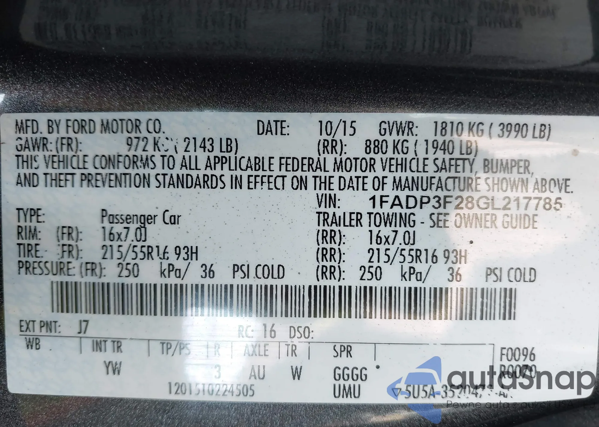LOT: 43071002 VIN: 1FADP3F28GL217785