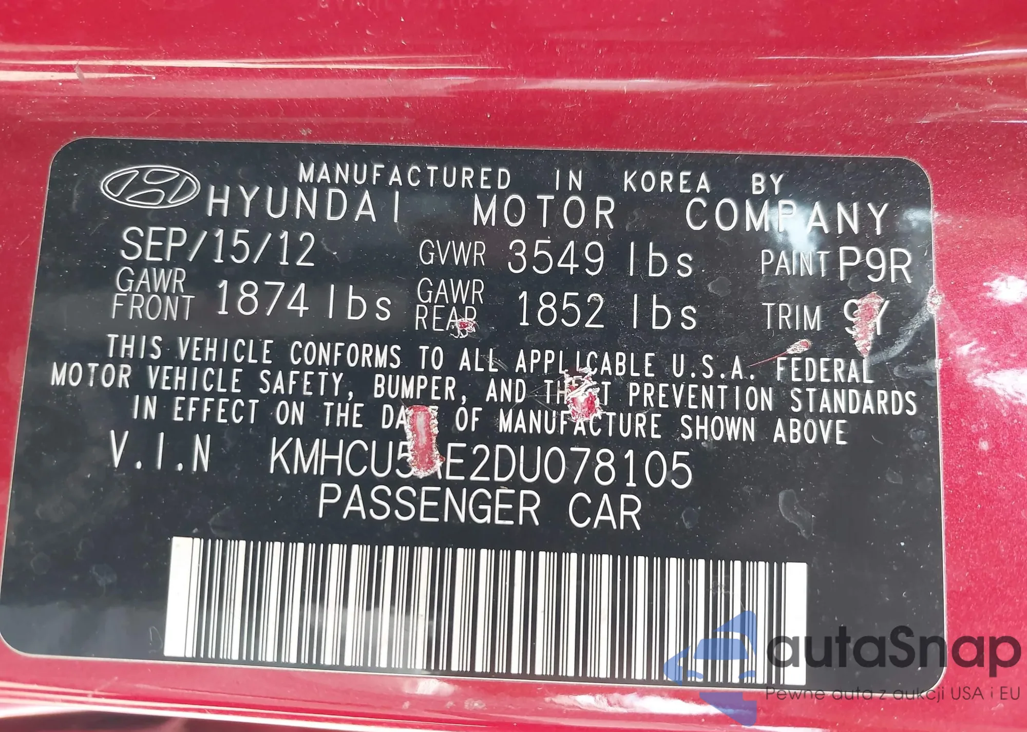 LOT: 42888953 VIN: KMHCU5AE2DU078105