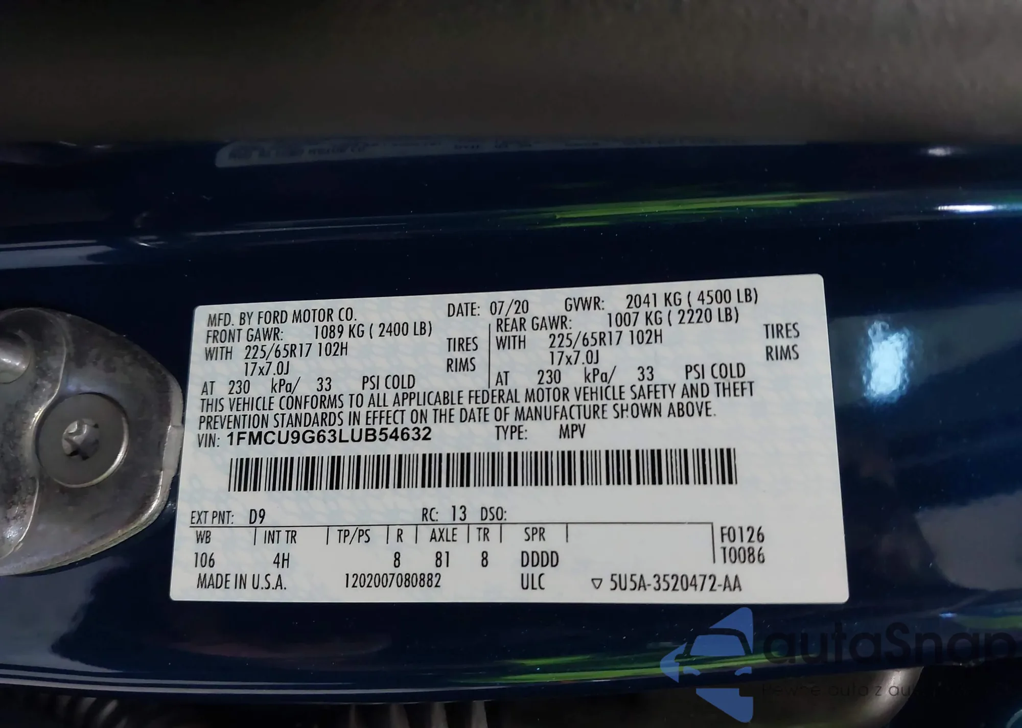 LOT: 43082949 VIN: 1FMCU9G63LUB54632