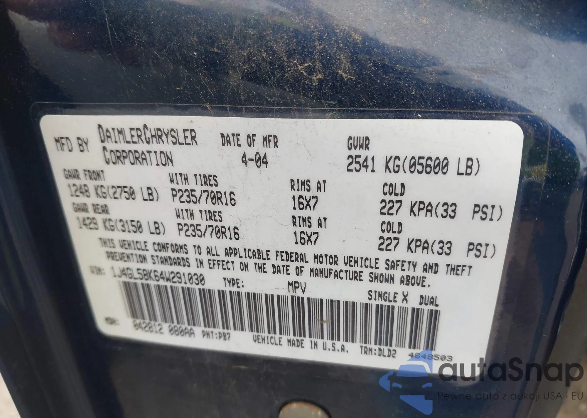 • VIN 1J4GL58K64W291030