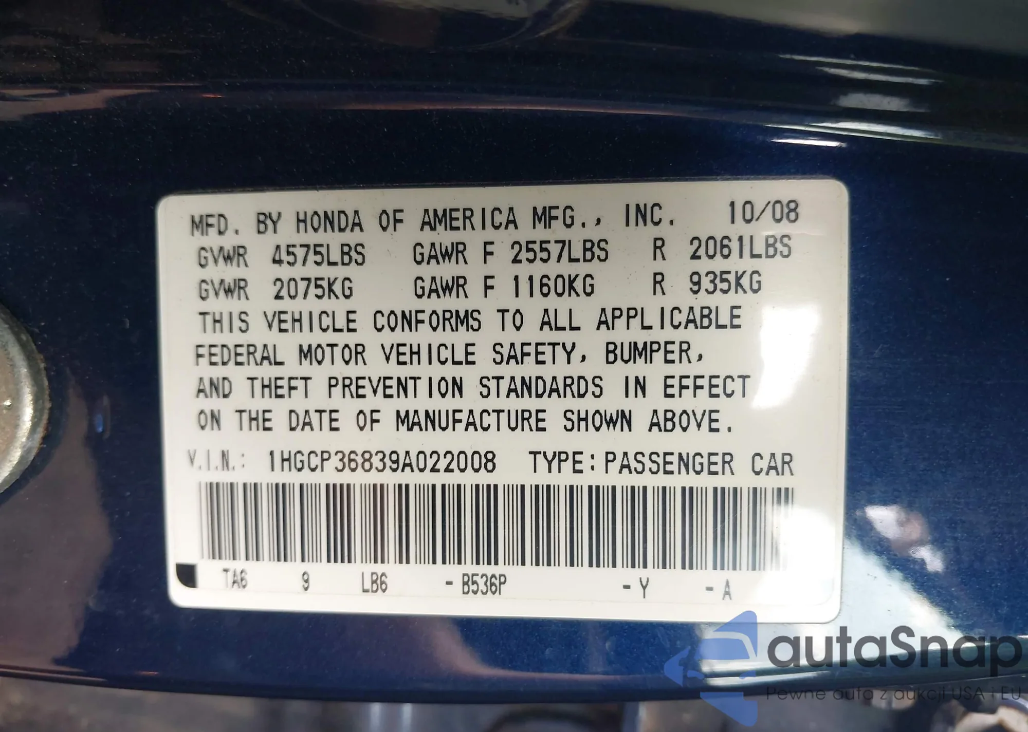 LOT: 43159997 VIN: 1HGCP36839A022008