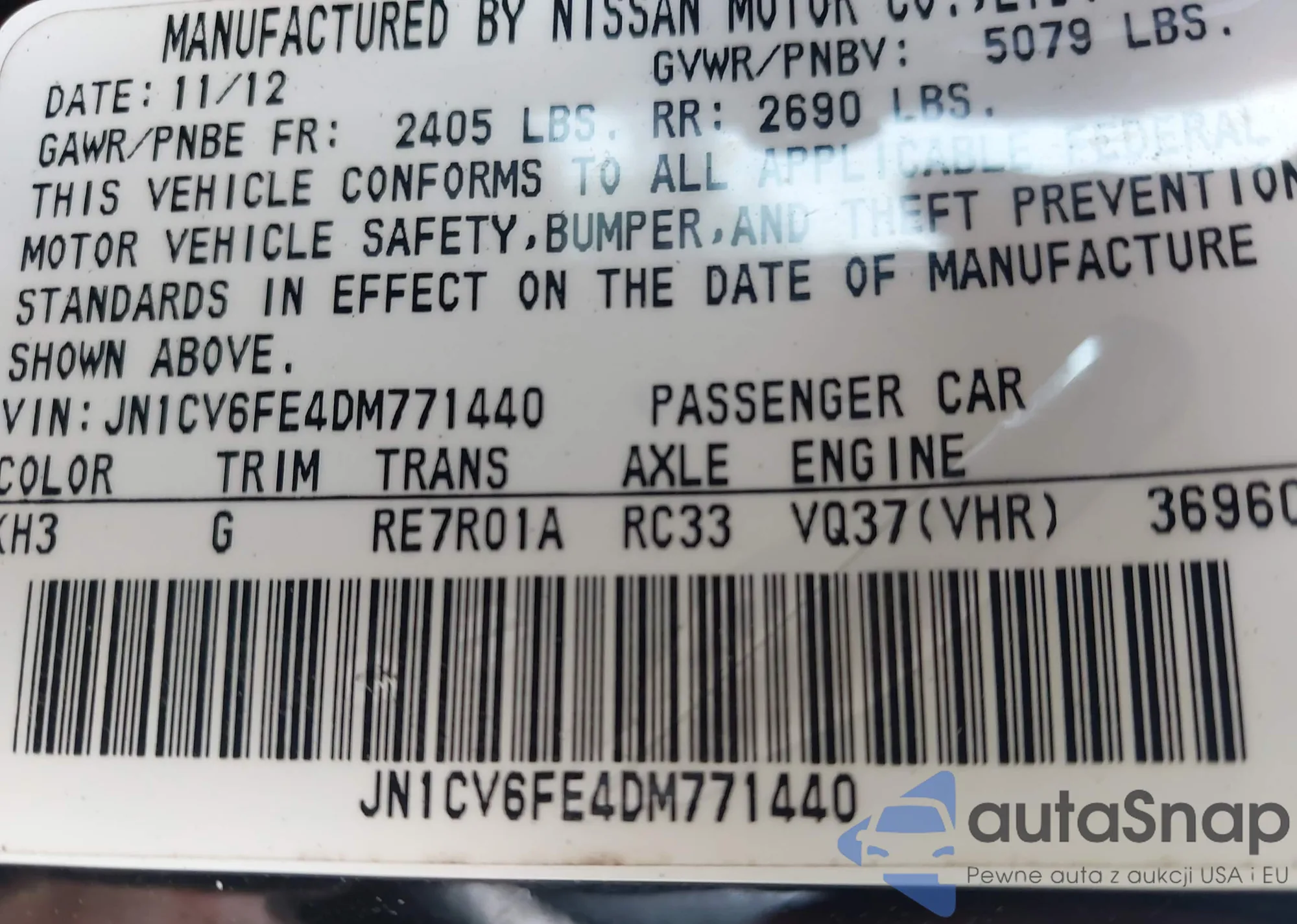 LOT: 42851976 VIN: JN1CV6FE4DM771440