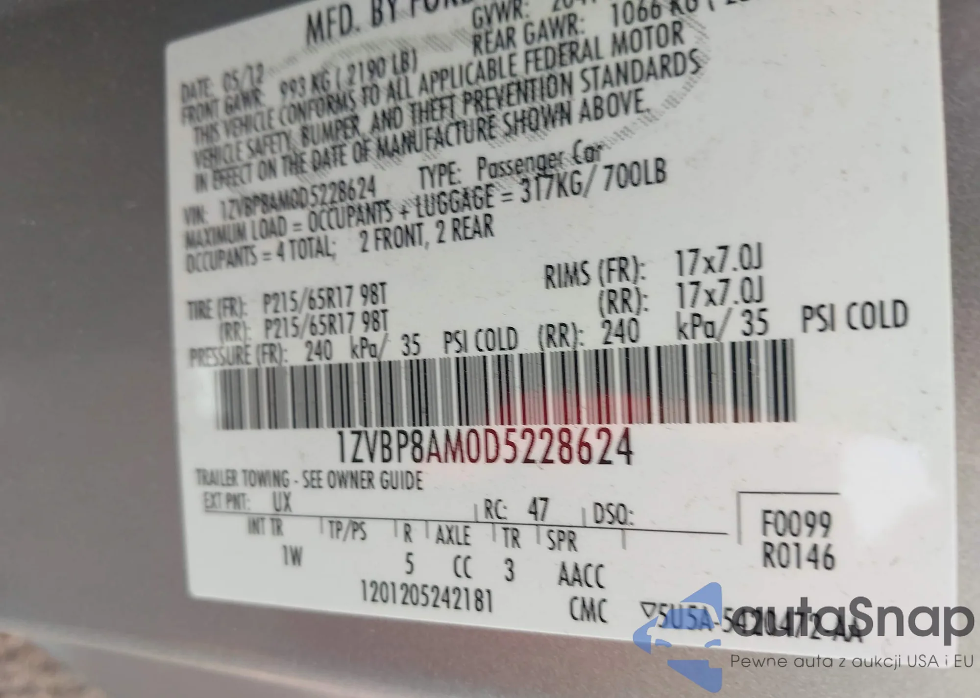 LOT: 43132609 VIN: 1ZVBP8AM0D5228624