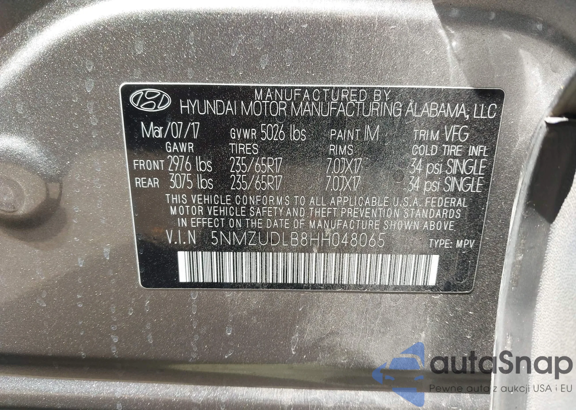 • VIN 5NMZUDLB8HH048065
