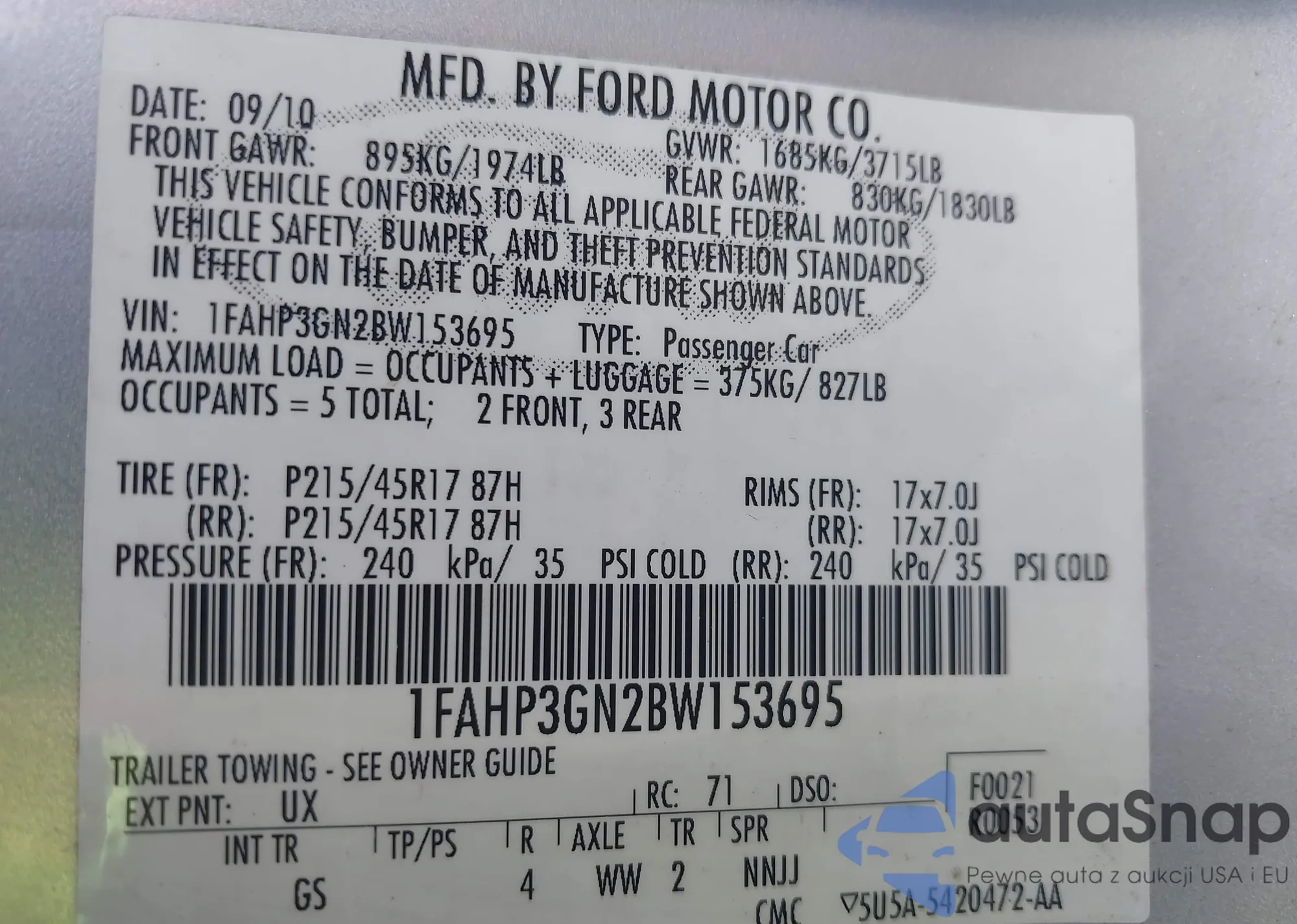 • VIN 1FAHP3GN2BW153695