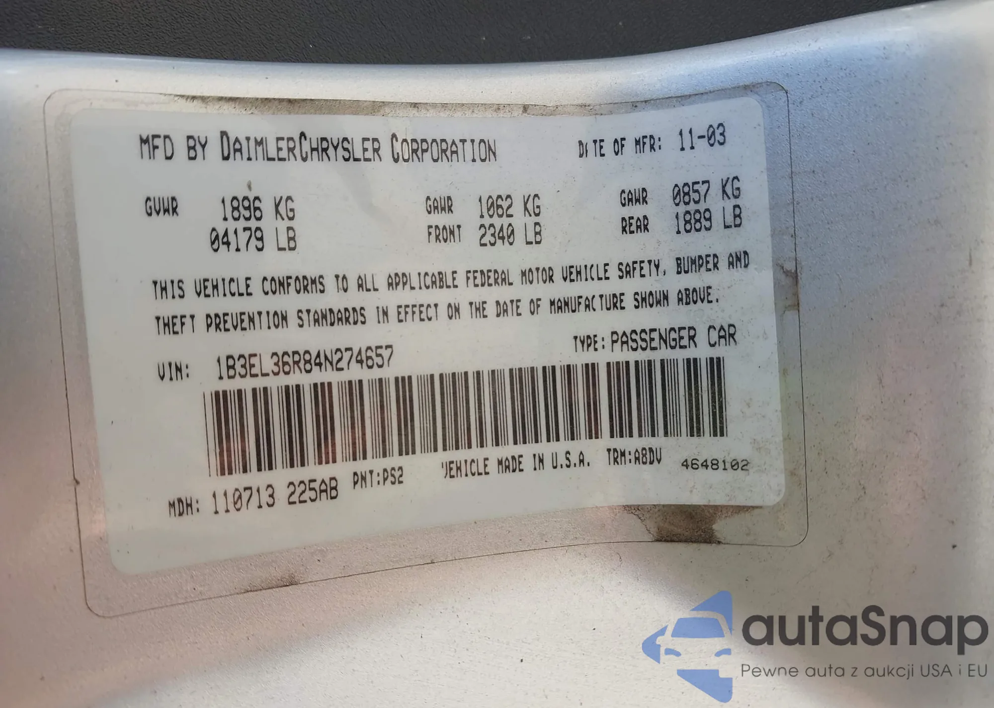 • VIN 1B3BK46D9KC425630