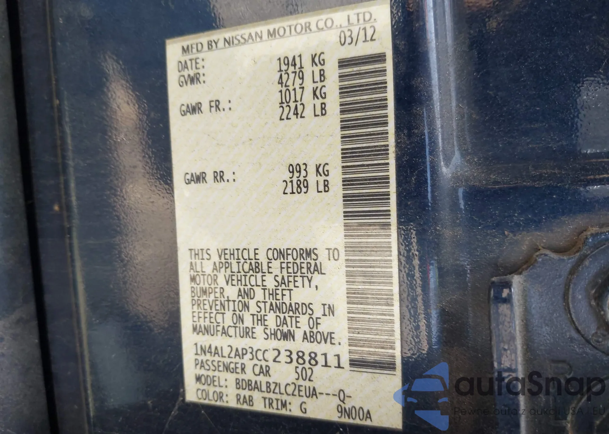 LOT: 43169601 VIN: 1N4AL2AP3CC238811