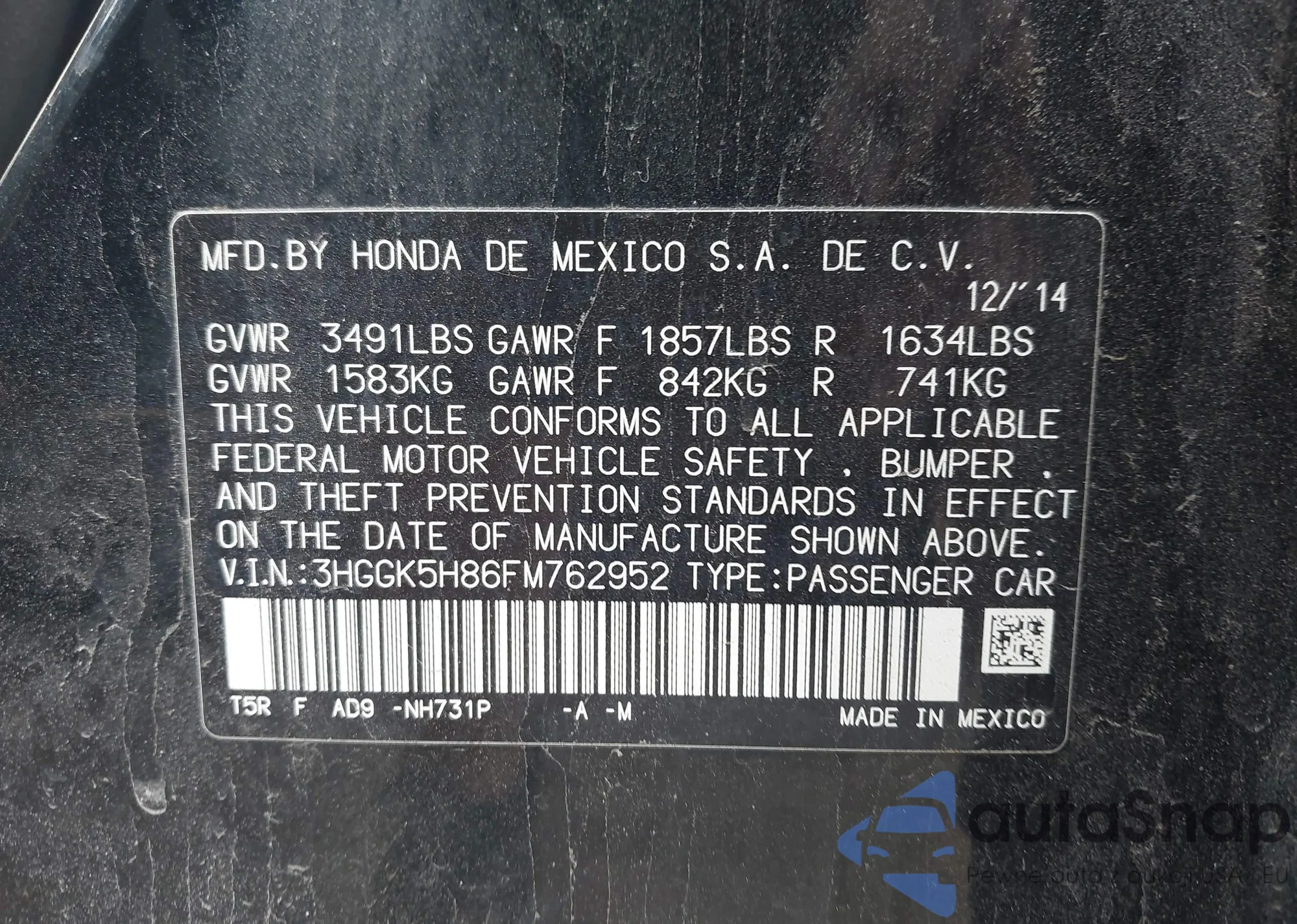 • VIN 3HGGK5H86FM762952
