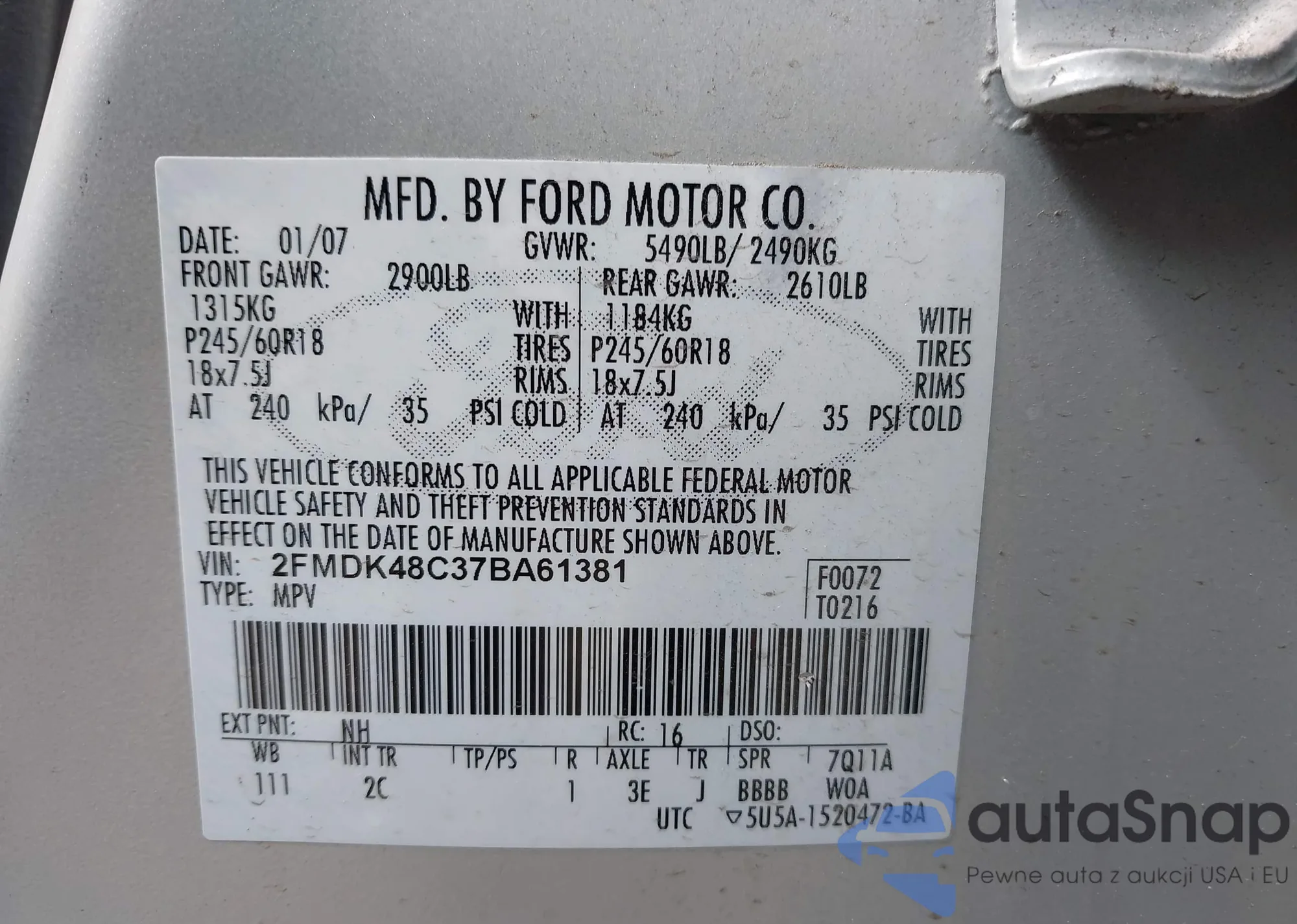 LOT: 43252518 VIN: 2FMDK48C37BA61381