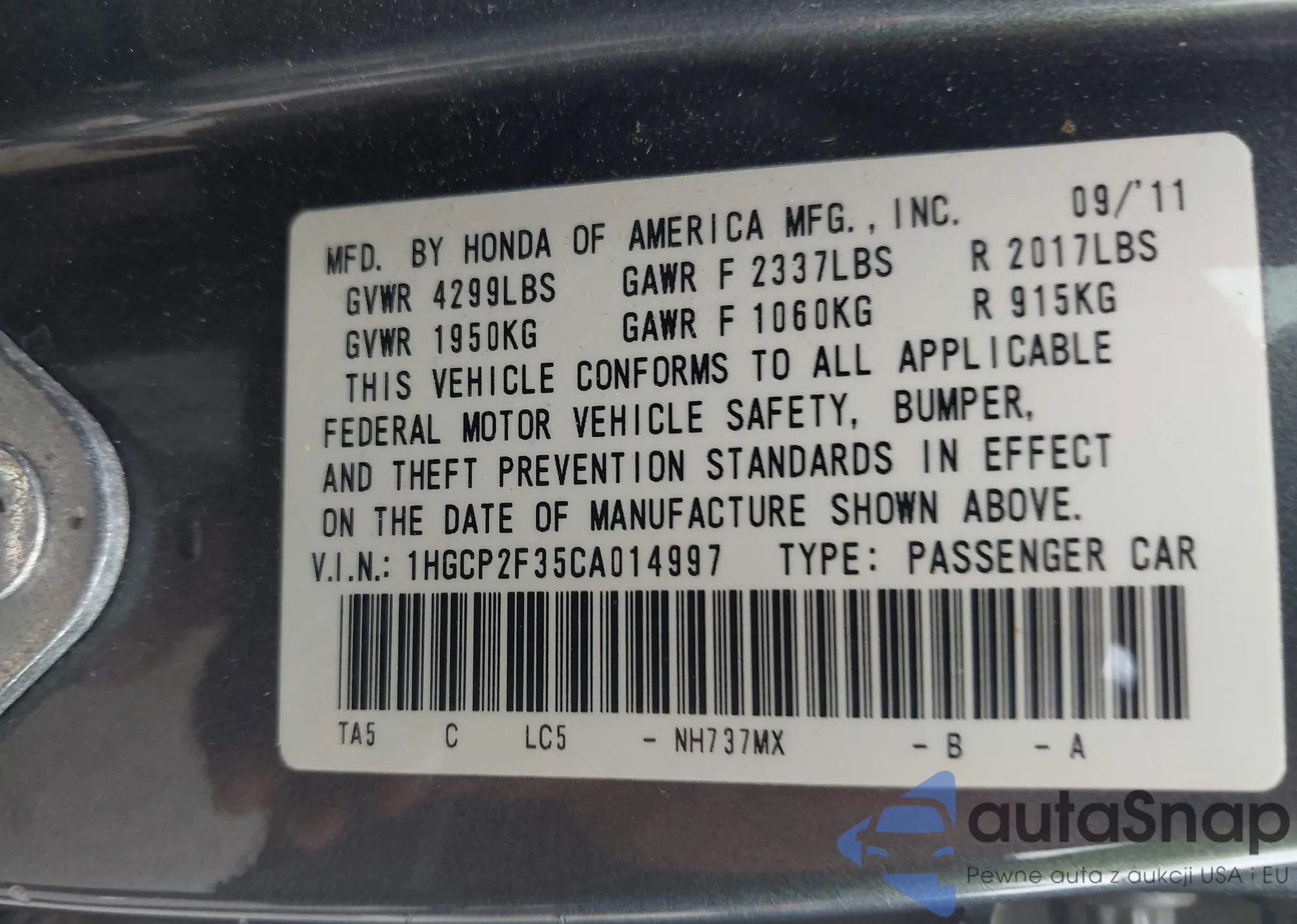 LOT: 43299607 VIN: 1HGCP2F35CA014997