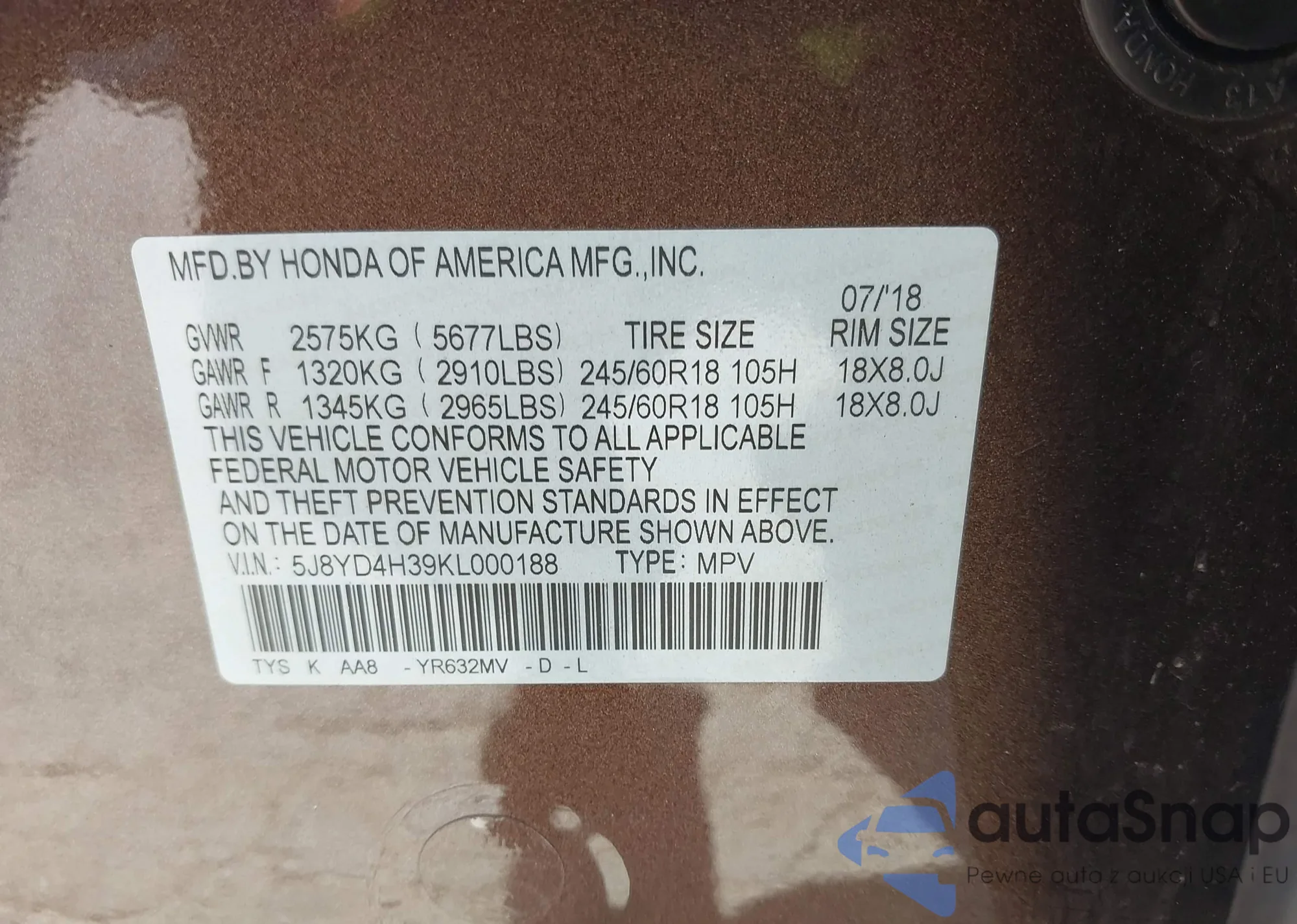 LOT: 42902623 VIN: 19UUB3F5XJA004005