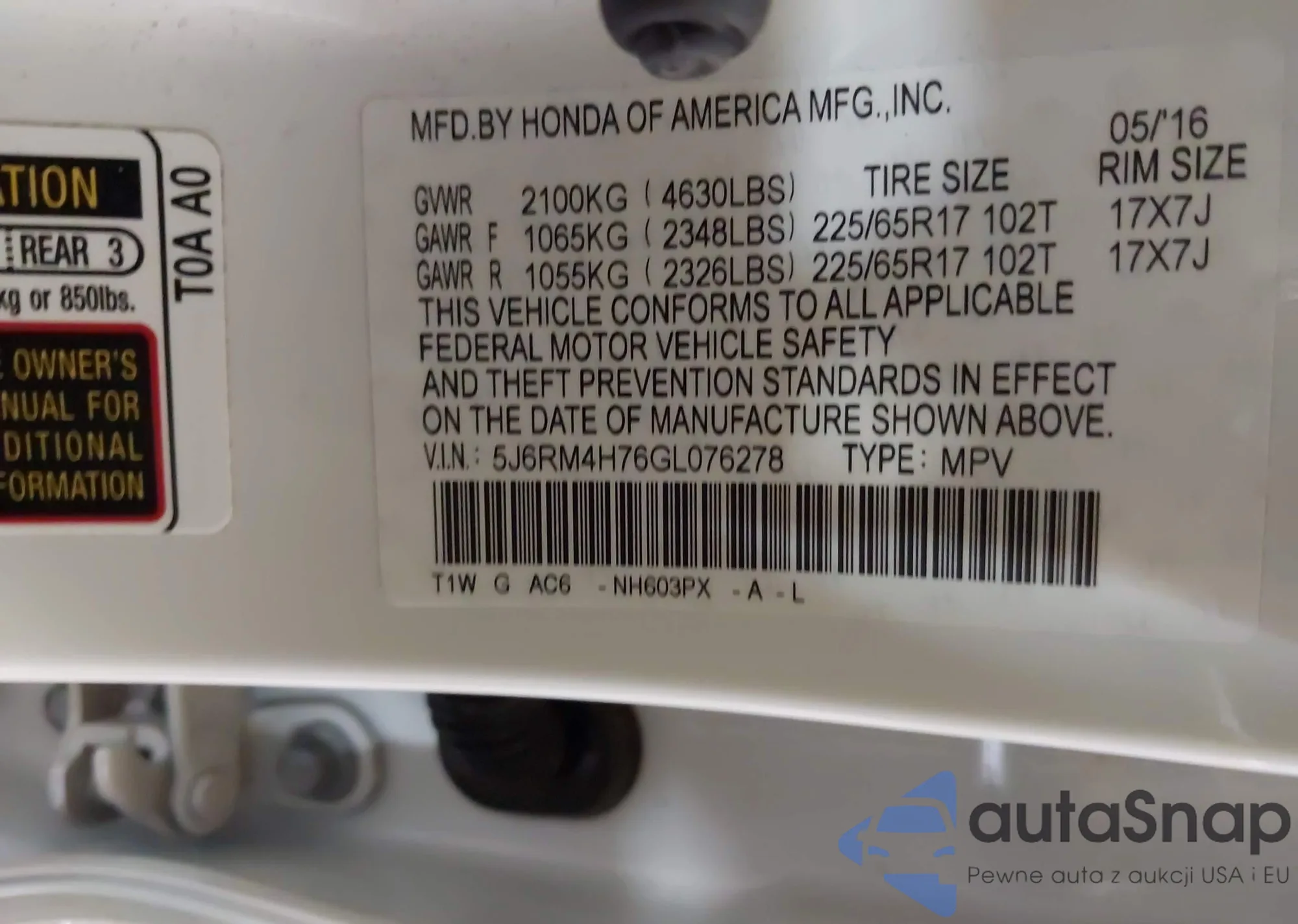 • VIN 5J6RE4H79BL052031
