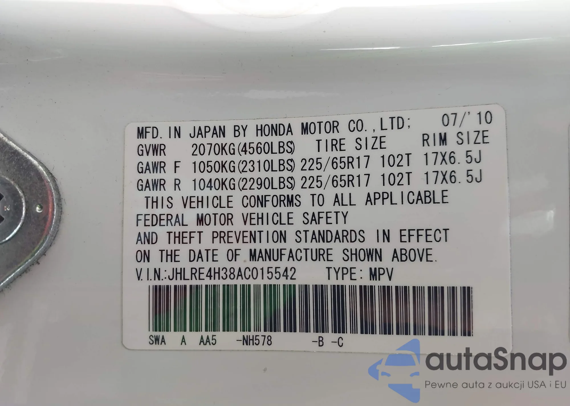 • VIN JHLRE4H38AC015542