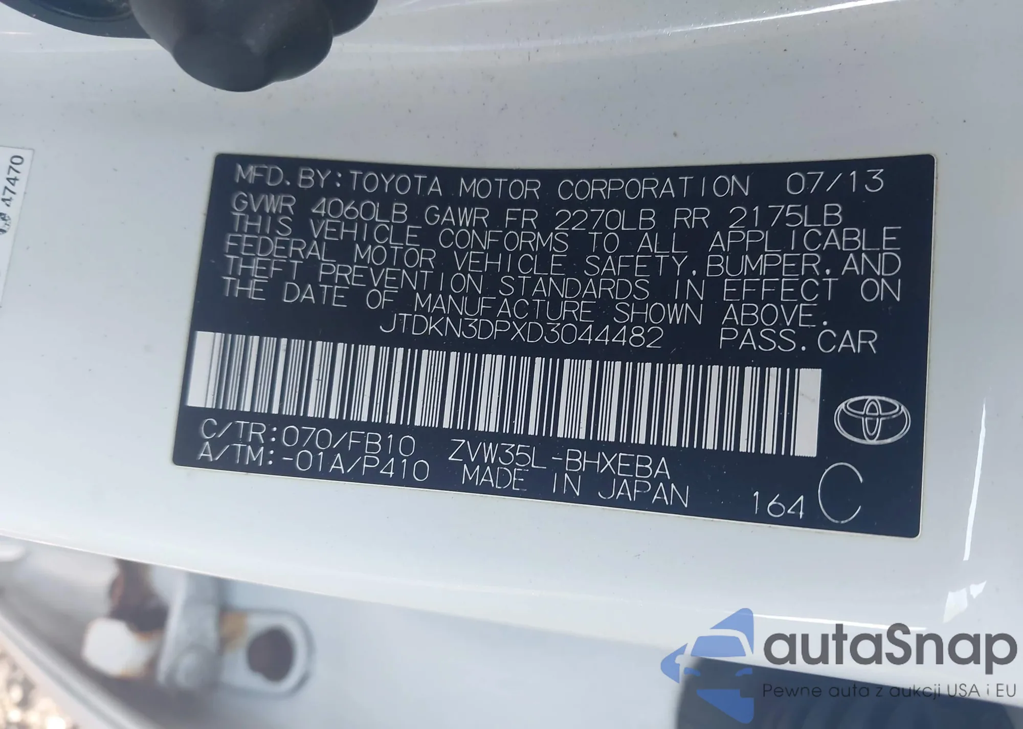 LOT: 43167302 VIN: JTDKN3DPXD3044482