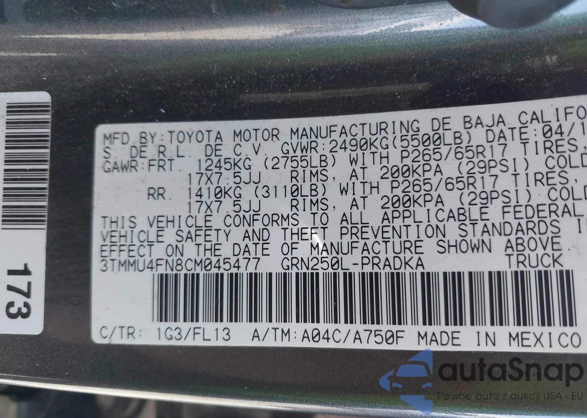 • VIN 3TMMU4FN8CM045477