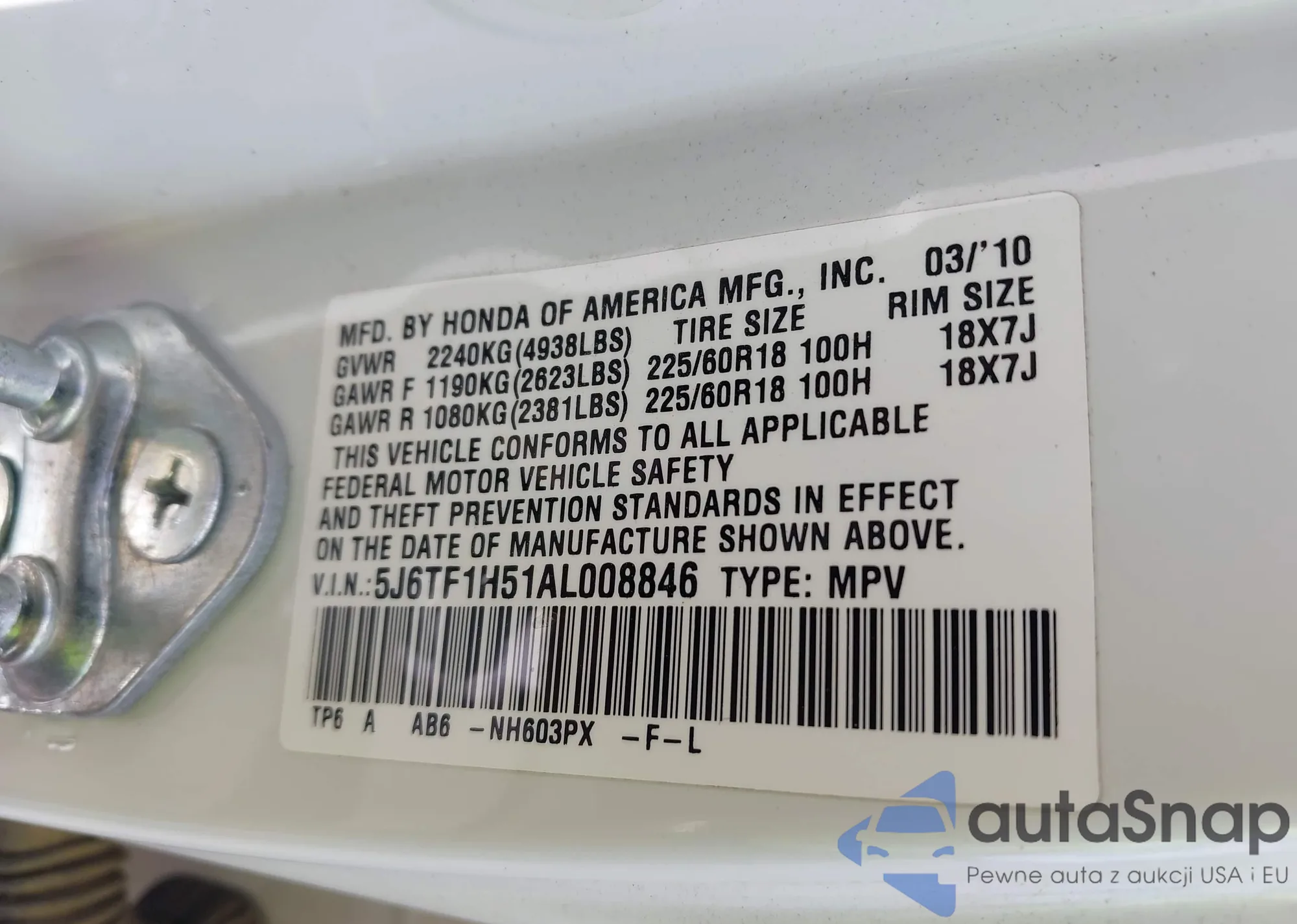 • VIN 5J6RE3H52BL061064