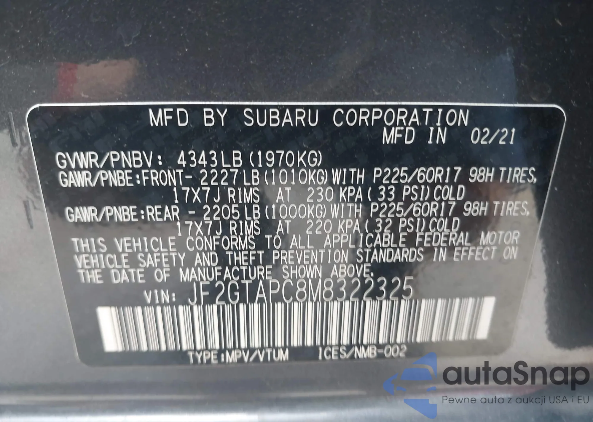 • VIN JF2GTAPC8M8322325