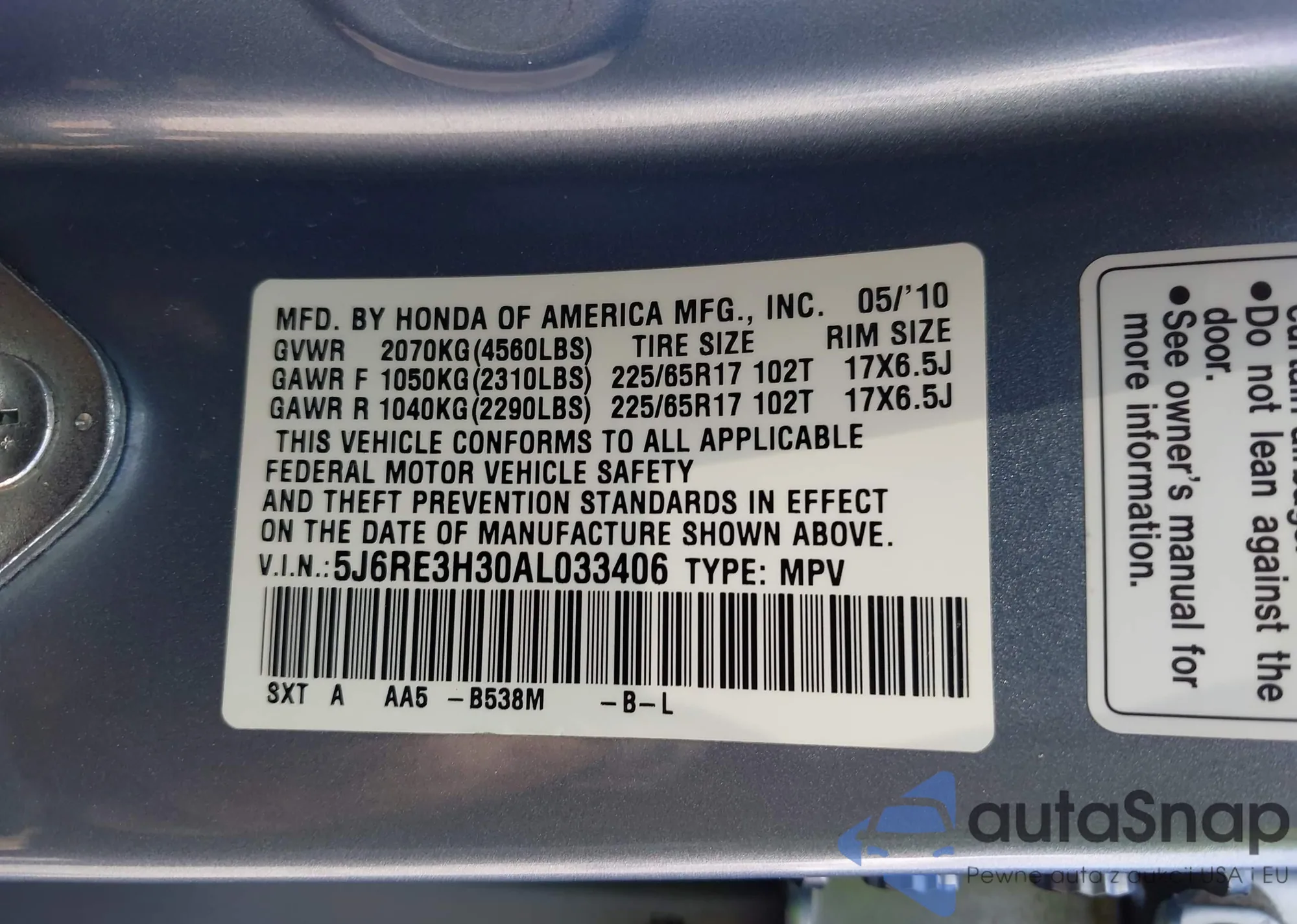 • VIN 19UDE2F37HA009835