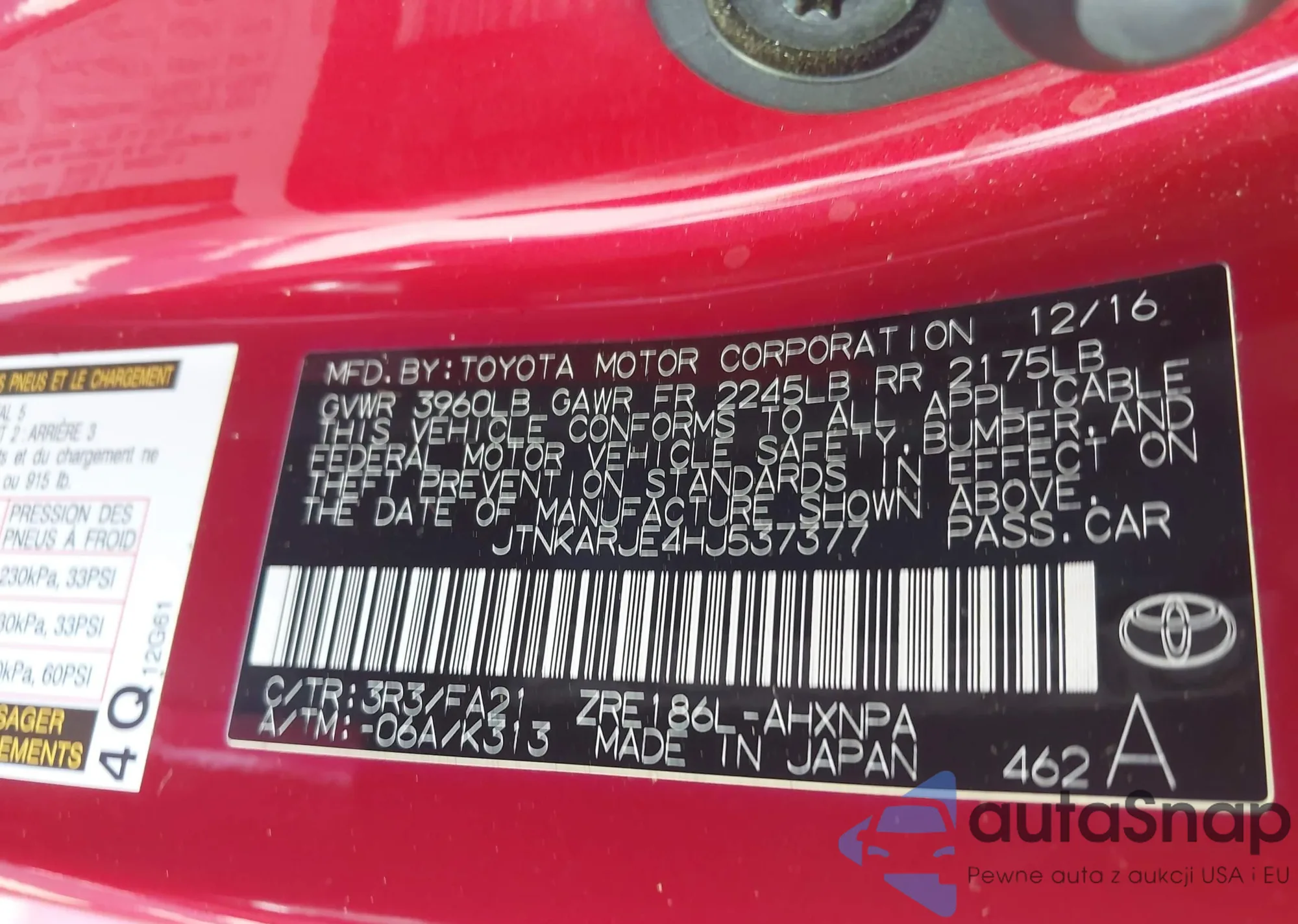 LOT: 43237772 VIN: JTNKARJE4HJ537377