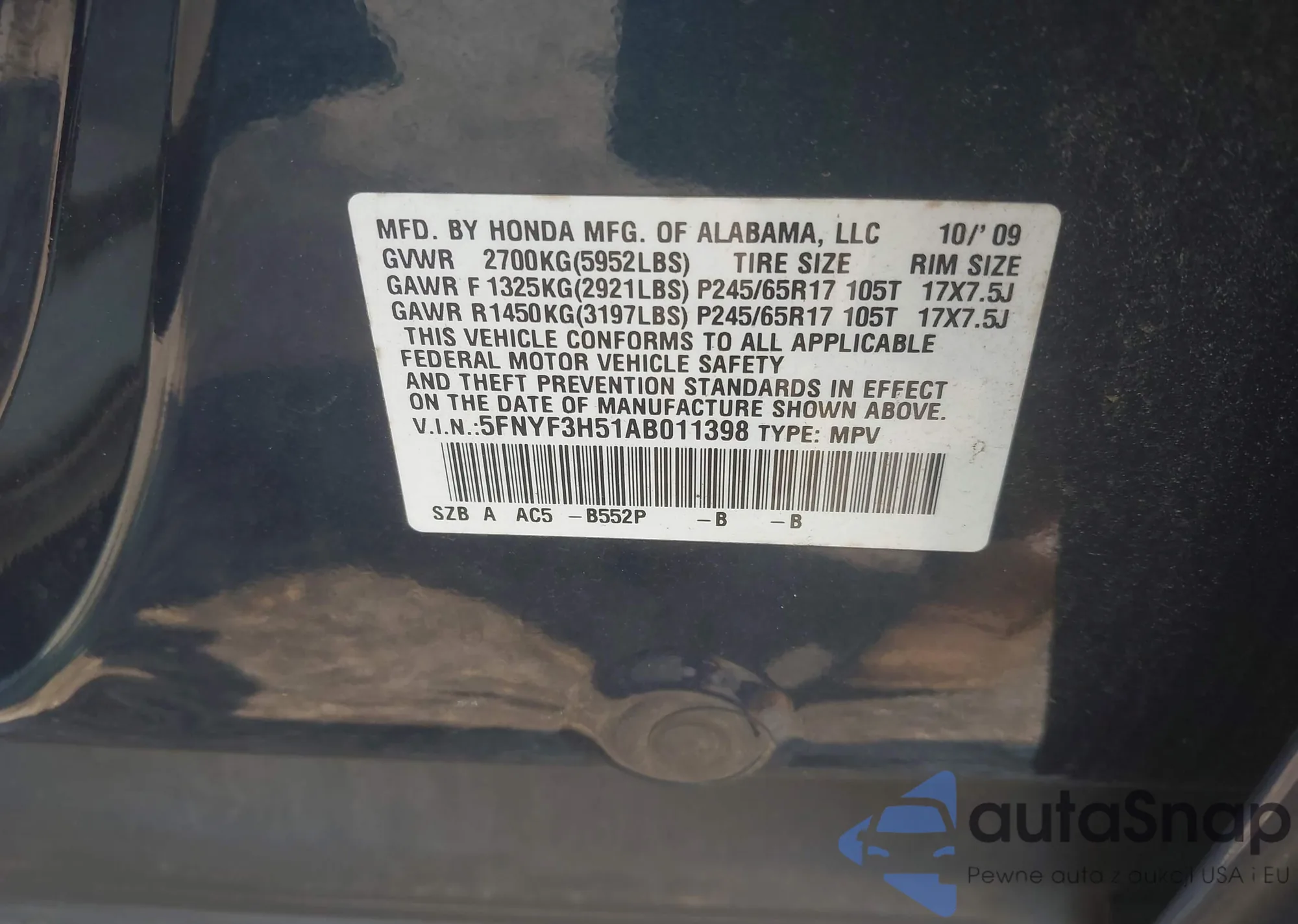 • VIN 5FNYF3H51AB011398