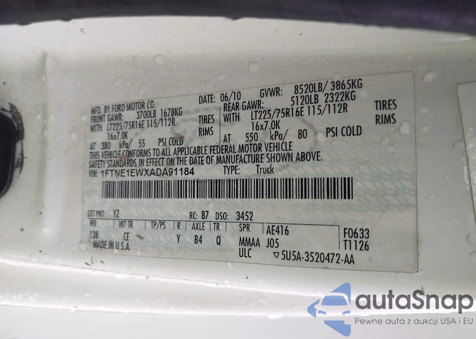 LOT: 41700237 VIN: 1FTNE1EWXADA91184