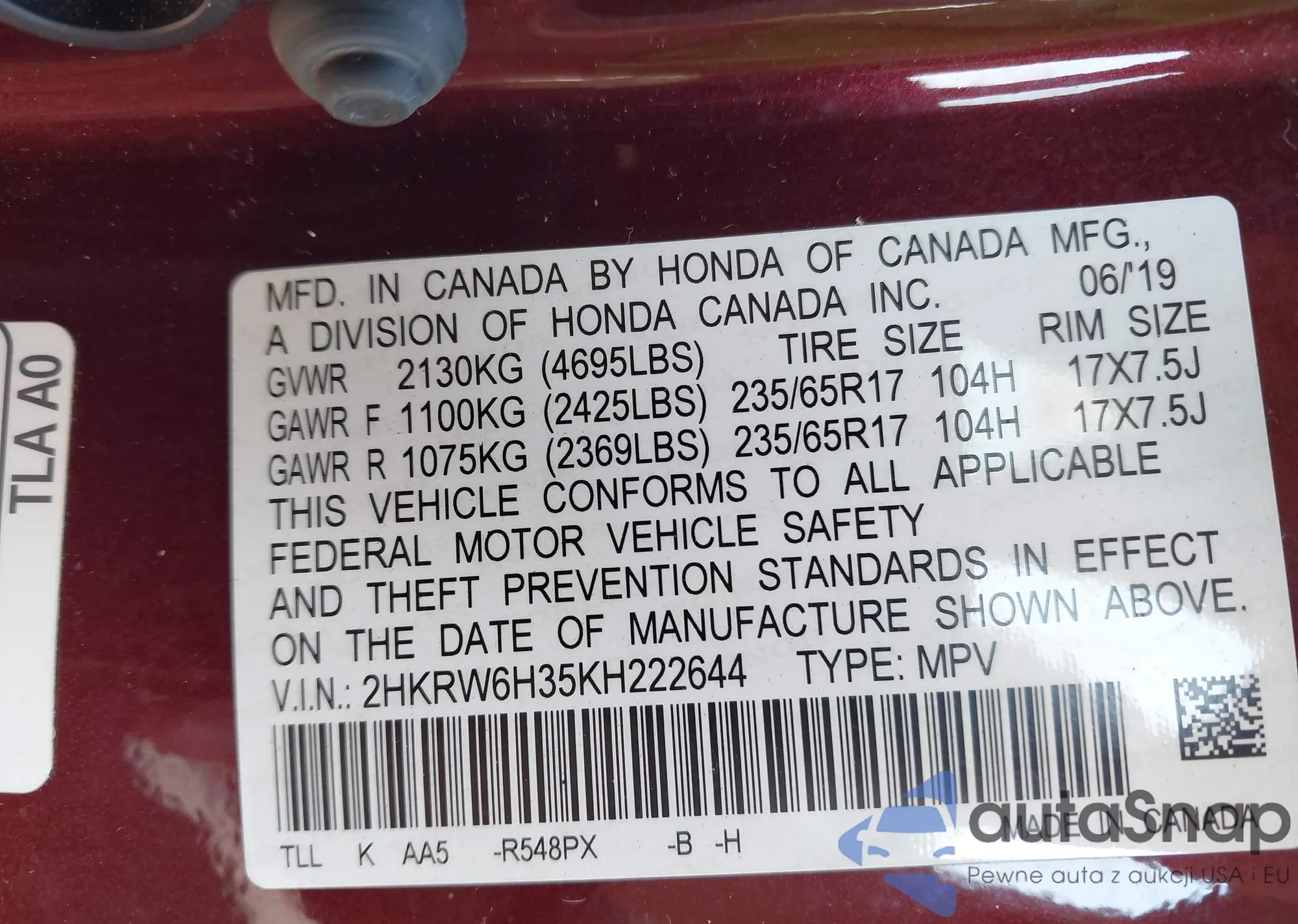LOT: 42846110 VIN: 3CZRU6H54KM732415
