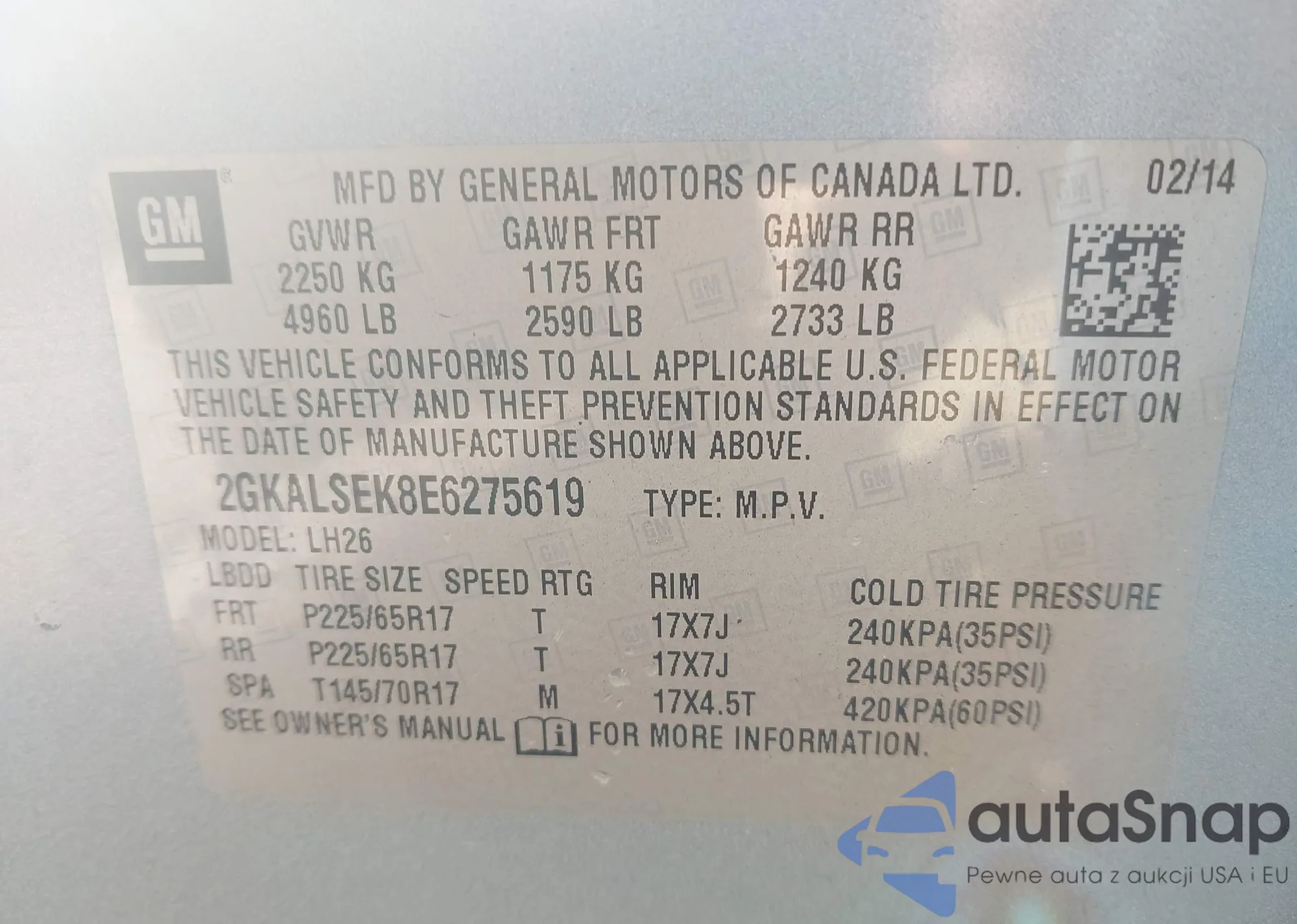 LOT: 43122093 VIN: 2GKALSEK8E6275619