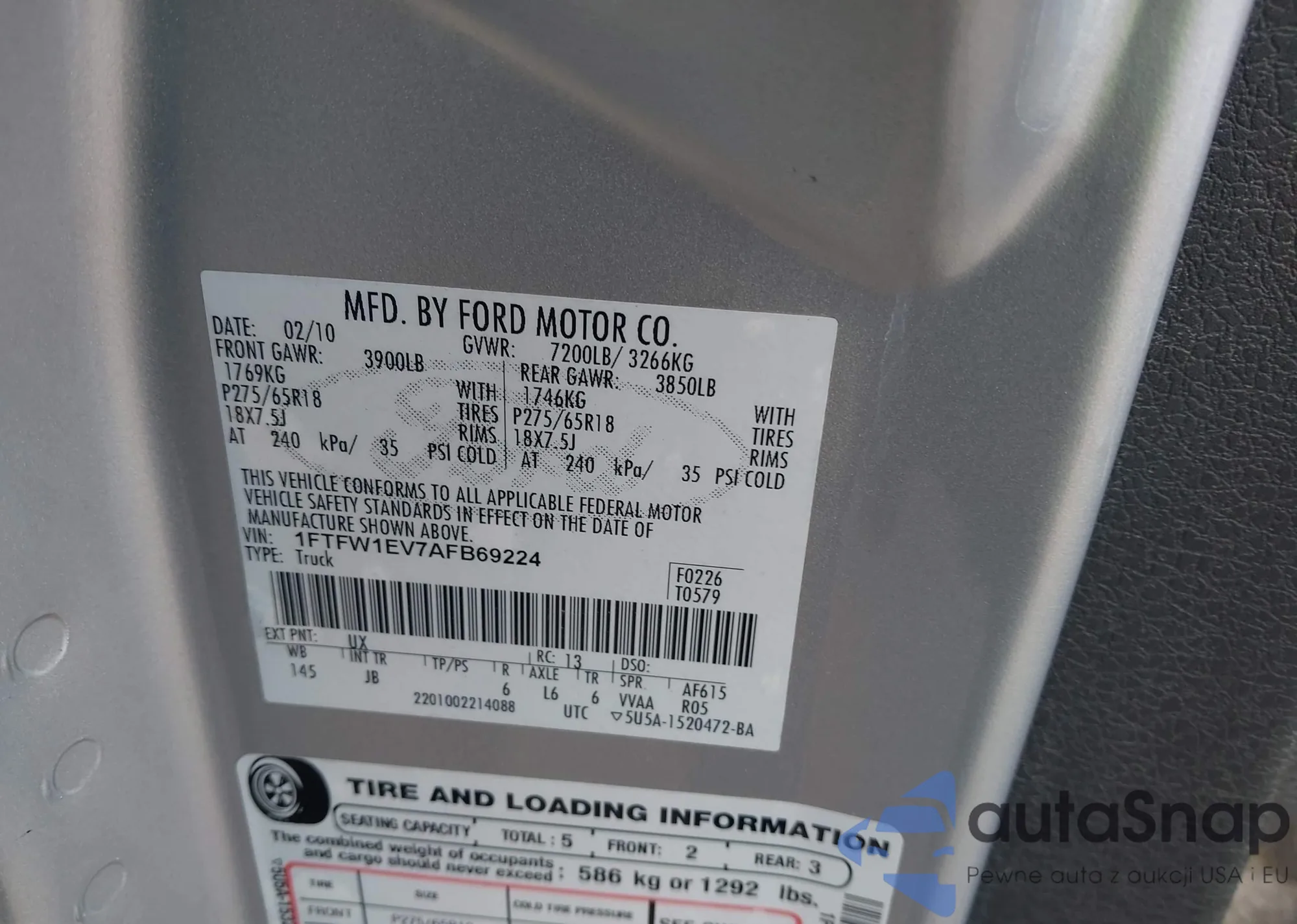 LOT: 43103447 VIN: 1FTFW1EV7AFB69224