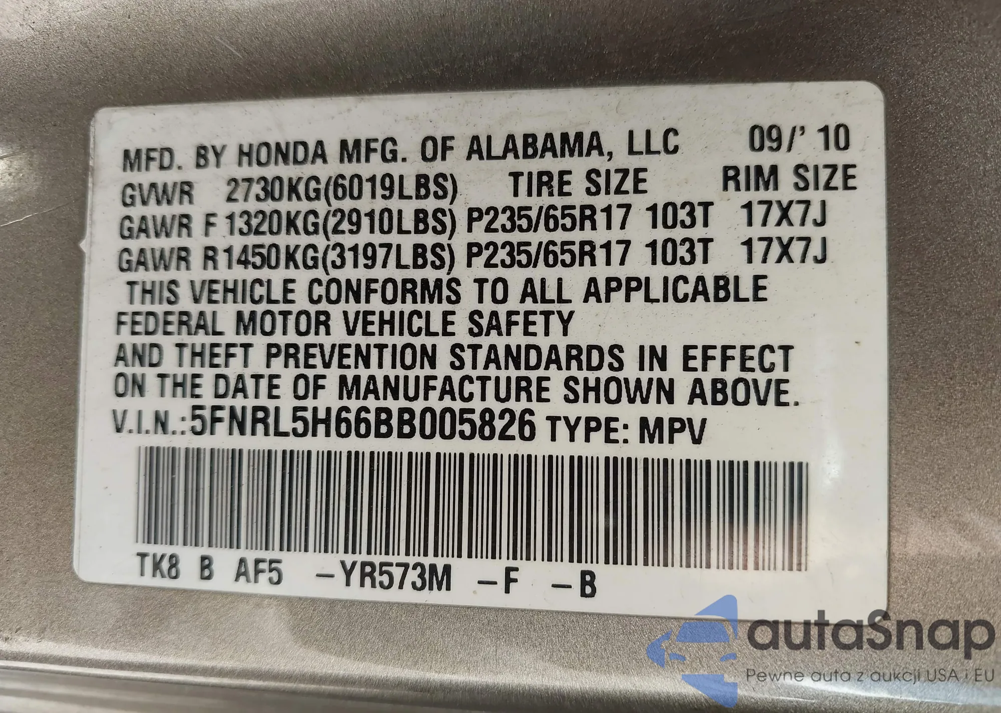 • VIN 5FNRL5H66BB005826