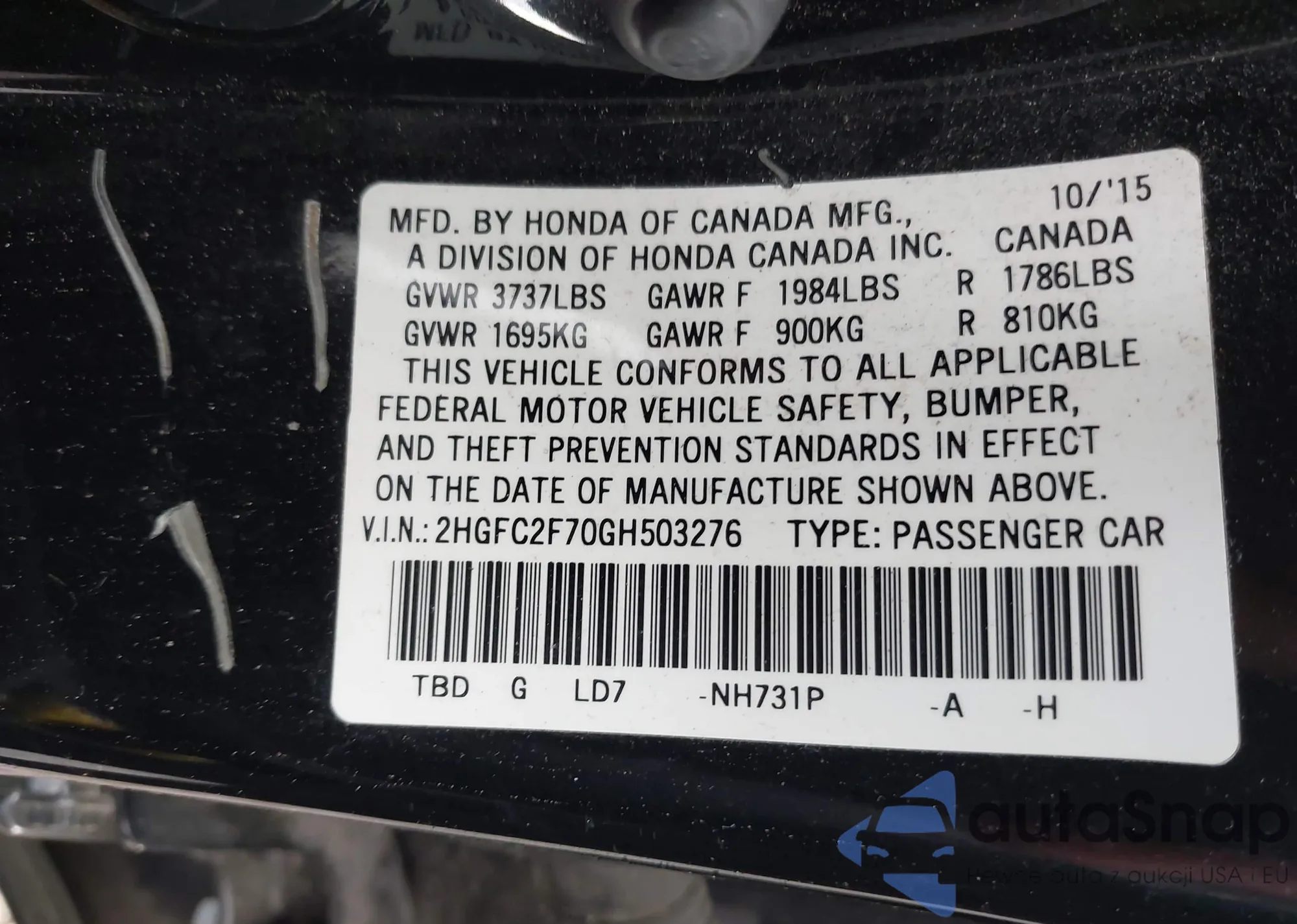• VIN 2HGFC2F70GH503276