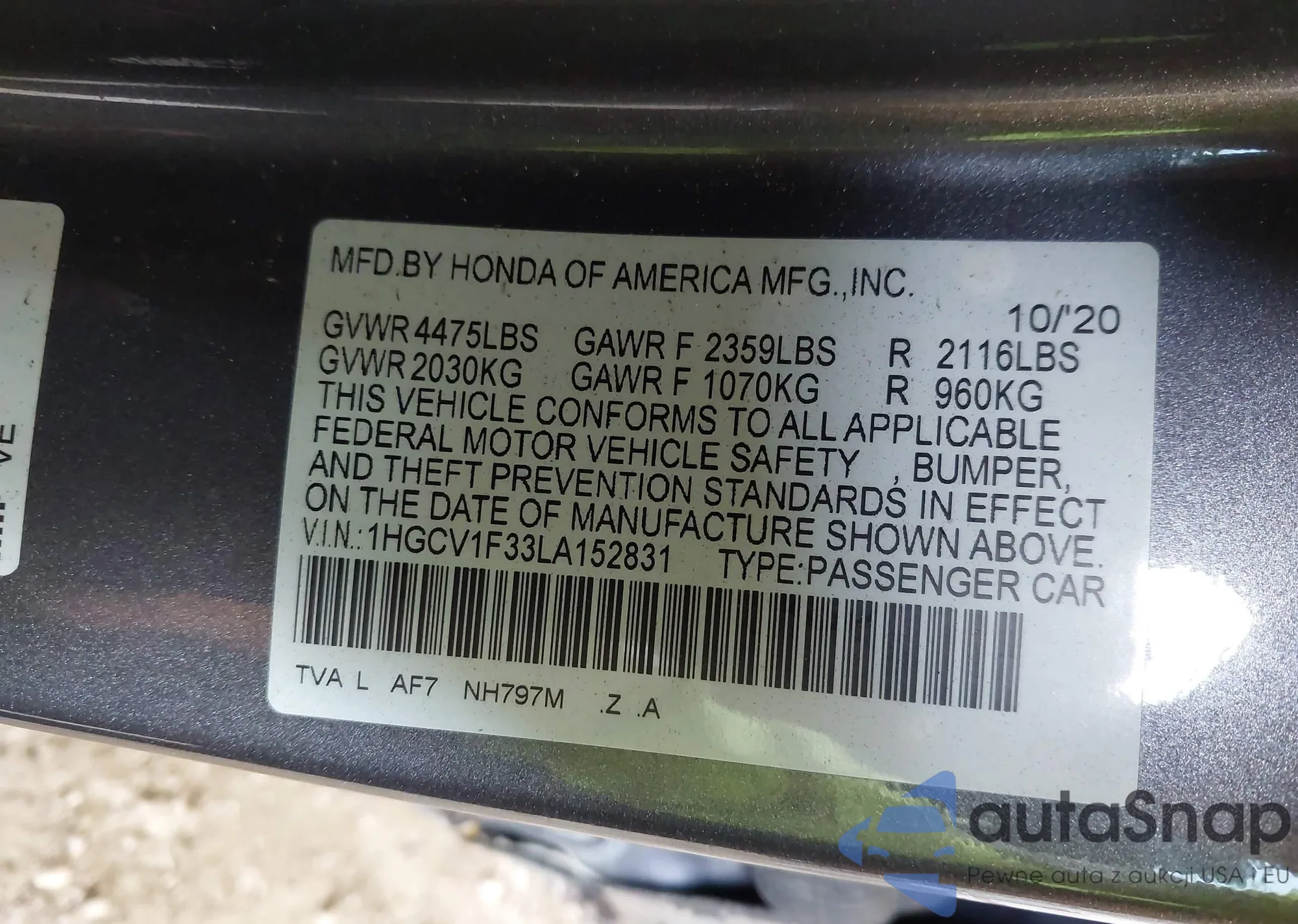 LOT: 42821130 VIN: 1HGCR2F37FA092986