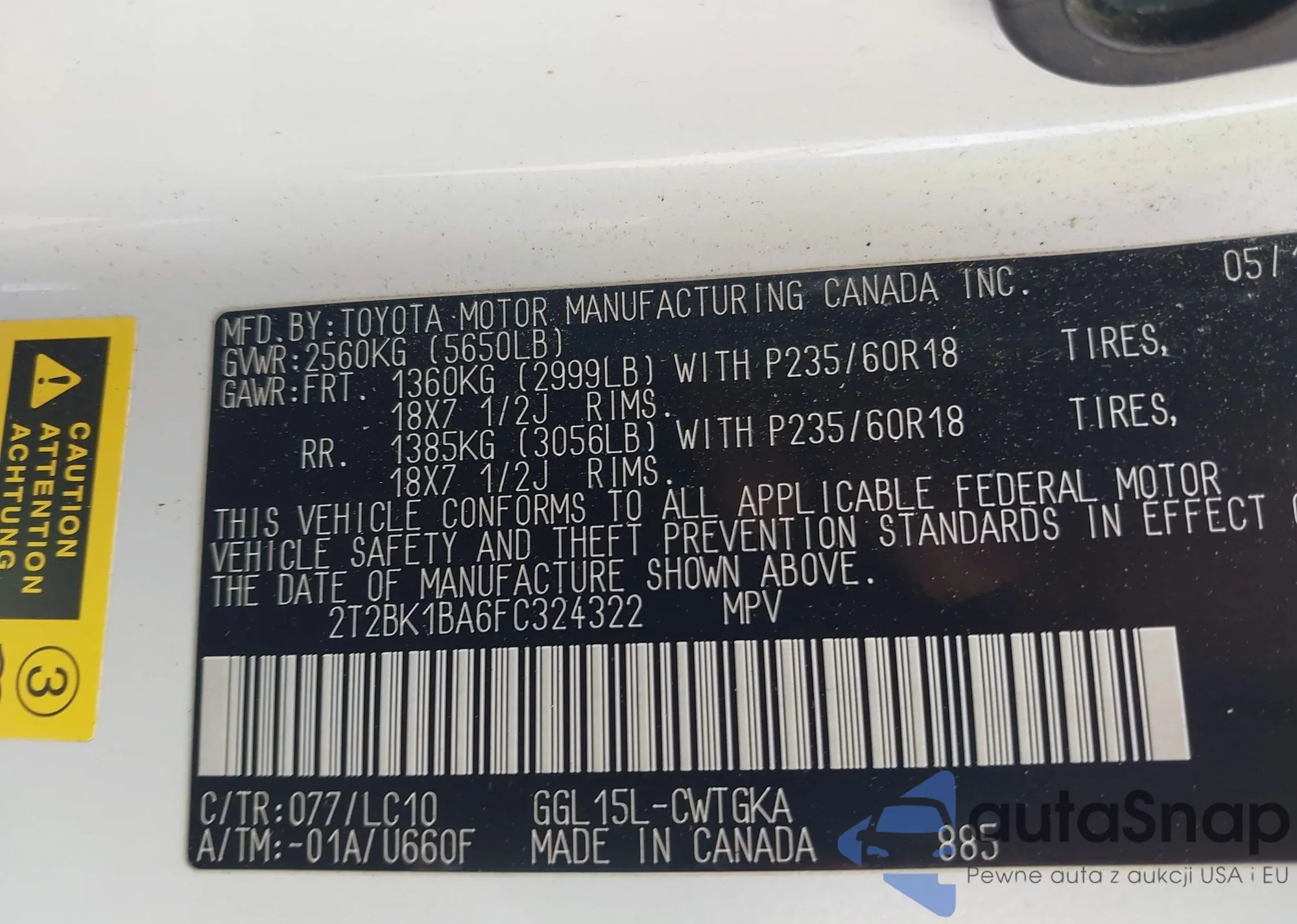 • VIN 2T2BK1BA6FC324322