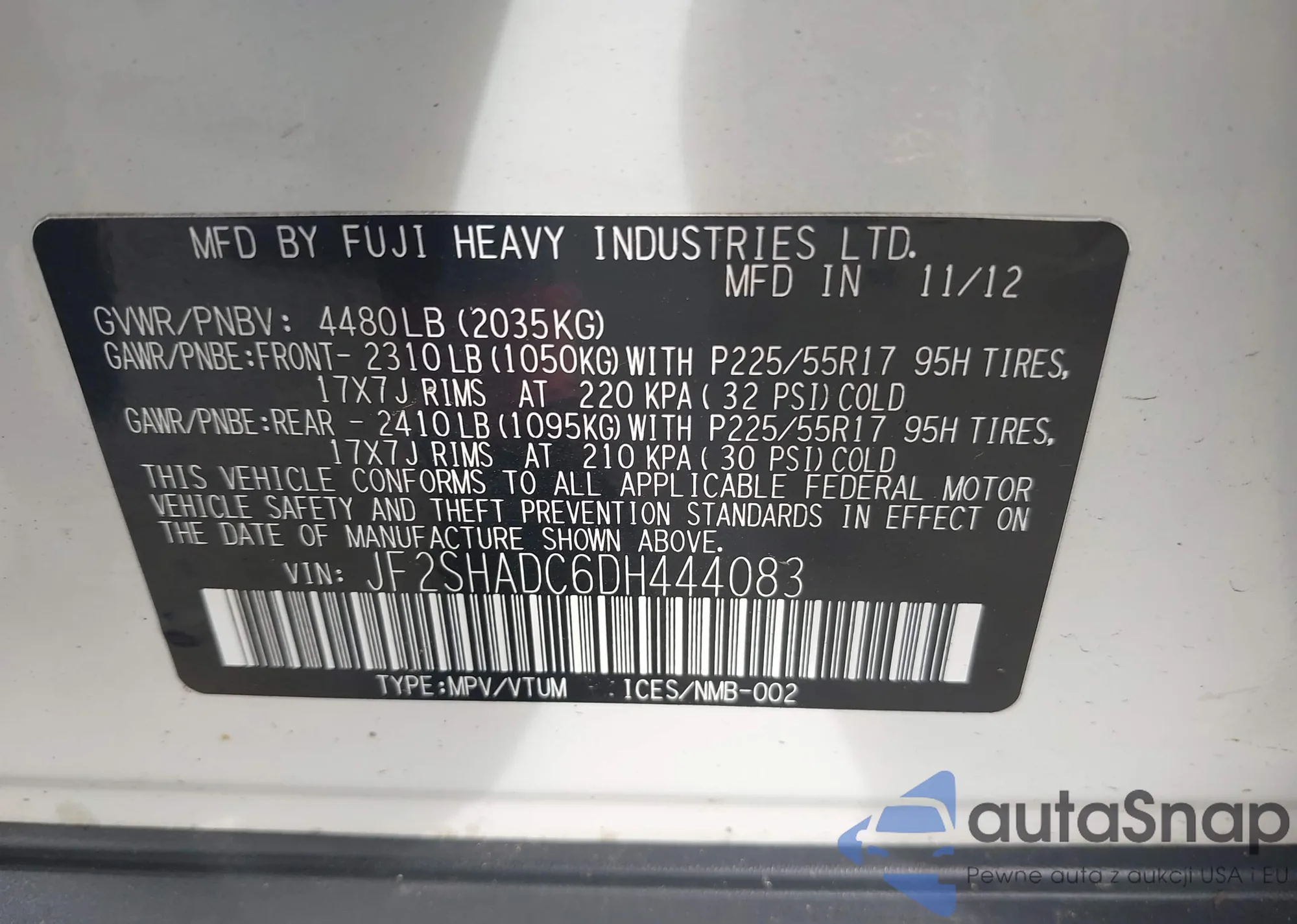 LOT: 42716437 VIN: JF2SHADC6DH444083