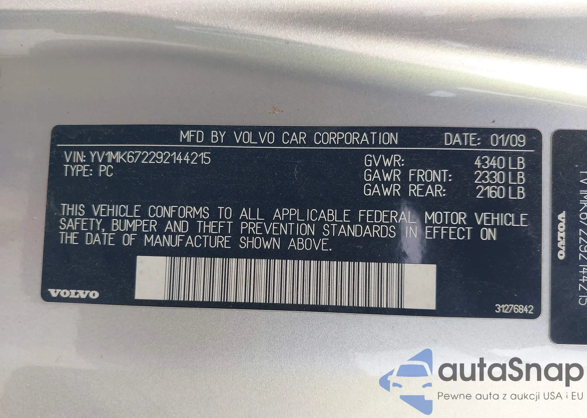 LOT: 42930628 VIN: YV1MK672292144215
