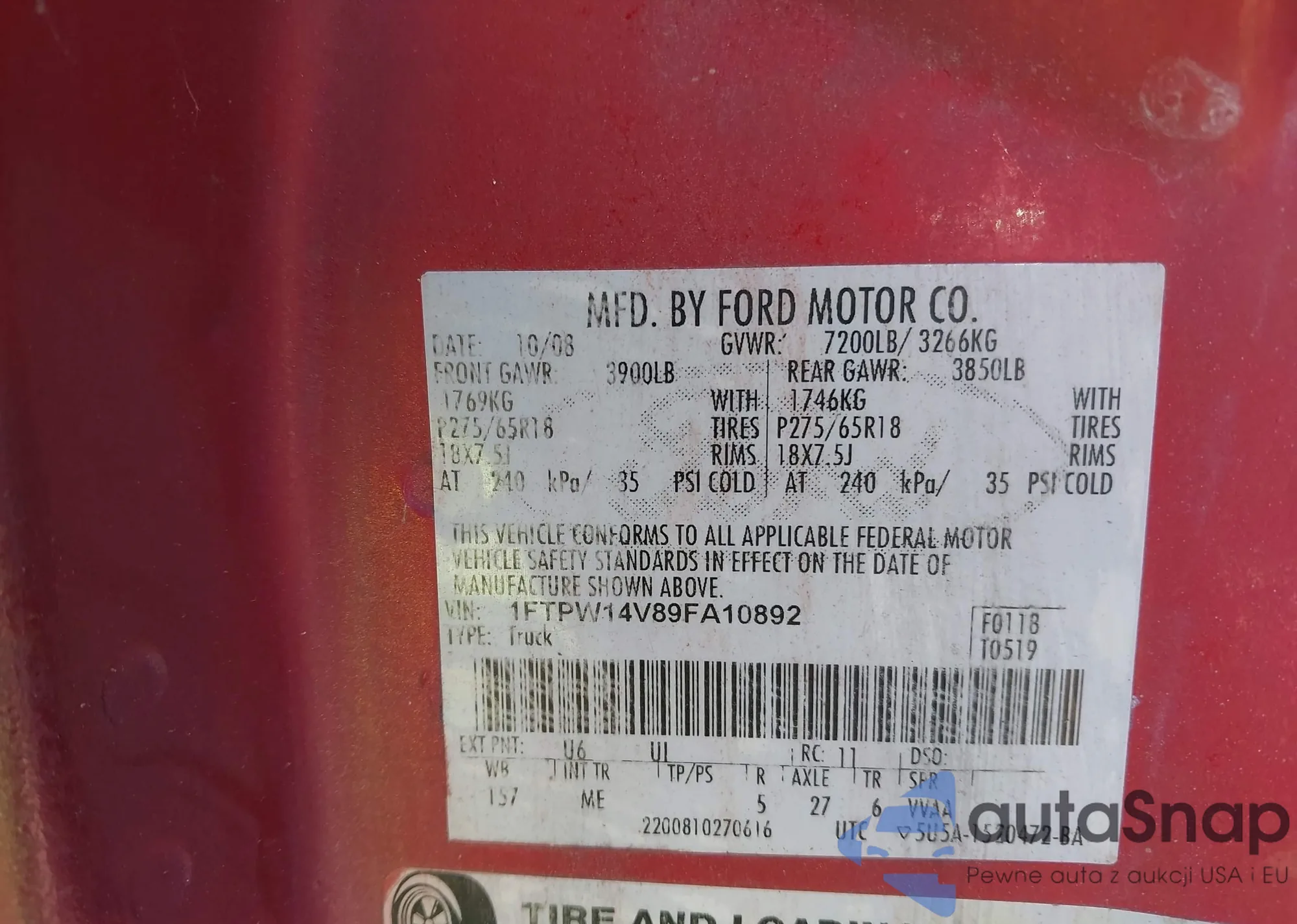 LOT: 43241247 VIN: 1FTPW14V89FA10892