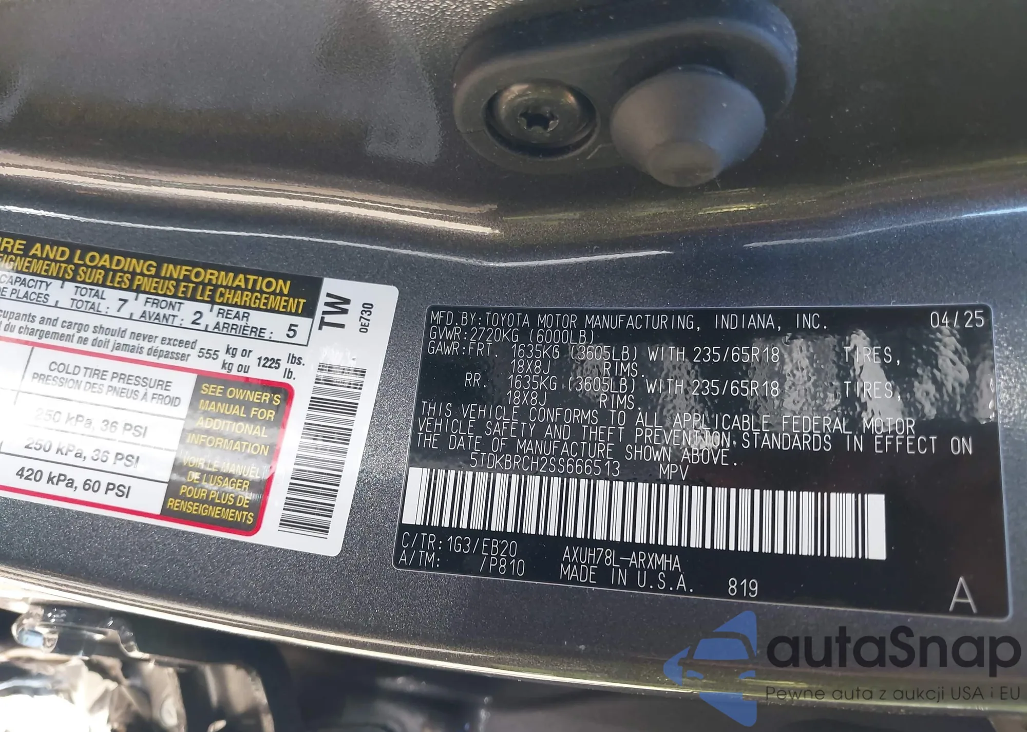 LOT: 43072491 VIN: 5TDKBRCH2SS666513
