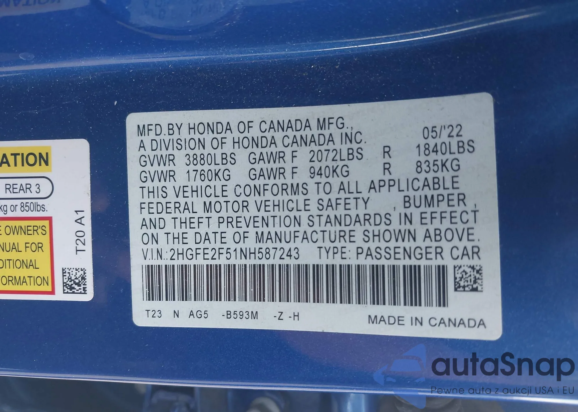 • VIN 2HGFE2F51NH587243