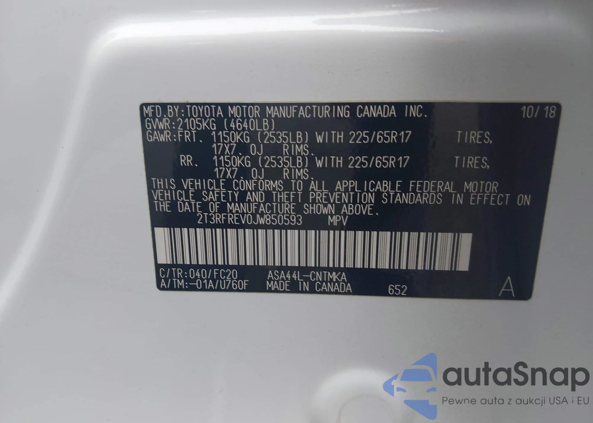LOT: 43009479 VIN: 2T3RFREV0JW850593