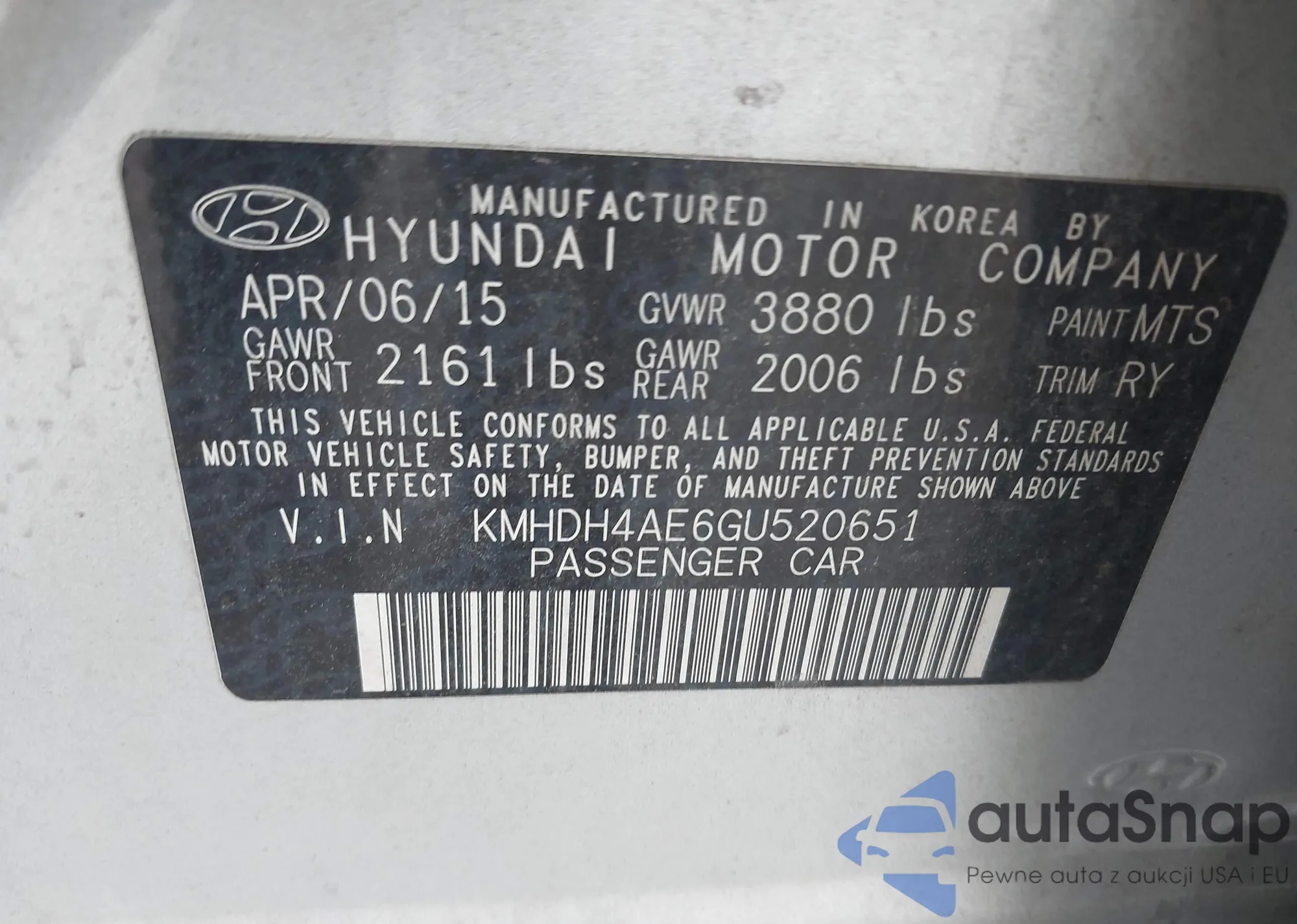 LOT: 43187097 VIN: KMHDH4AE6GU52O651