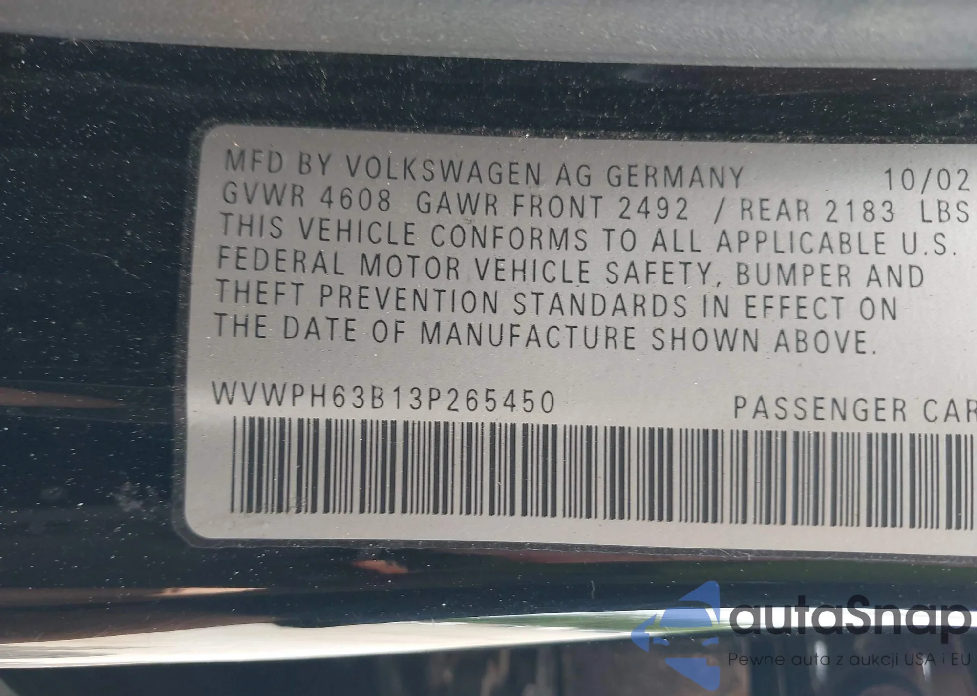 LOT: 42753538 VIN: WVWPH63B13P265450