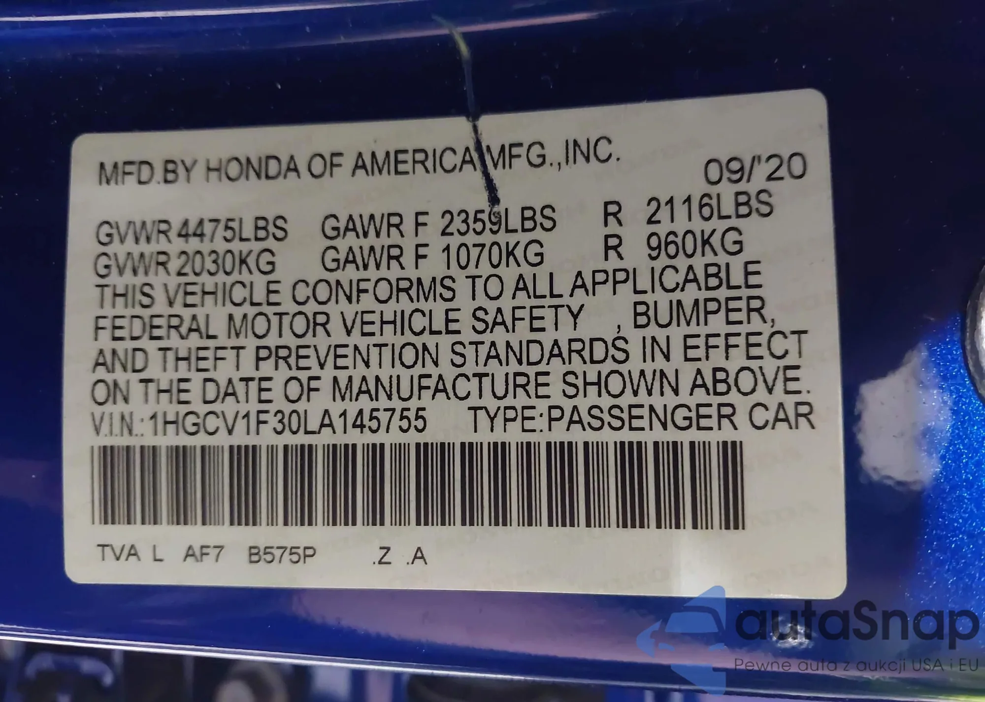 LOT: 42886508 VIN: 2HGFC3A58LH752348