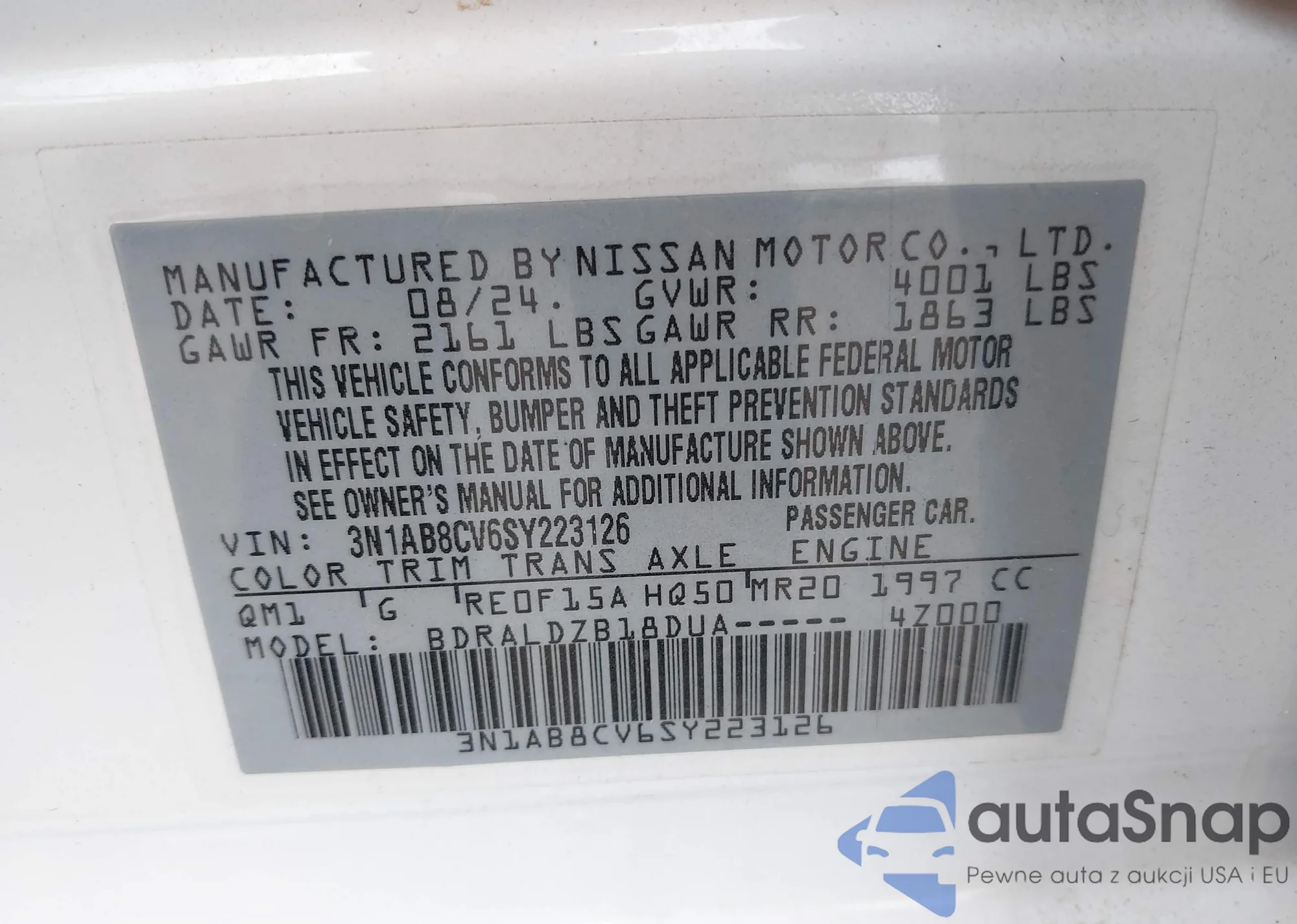 • VIN 3N1AB8CV6SY223126
