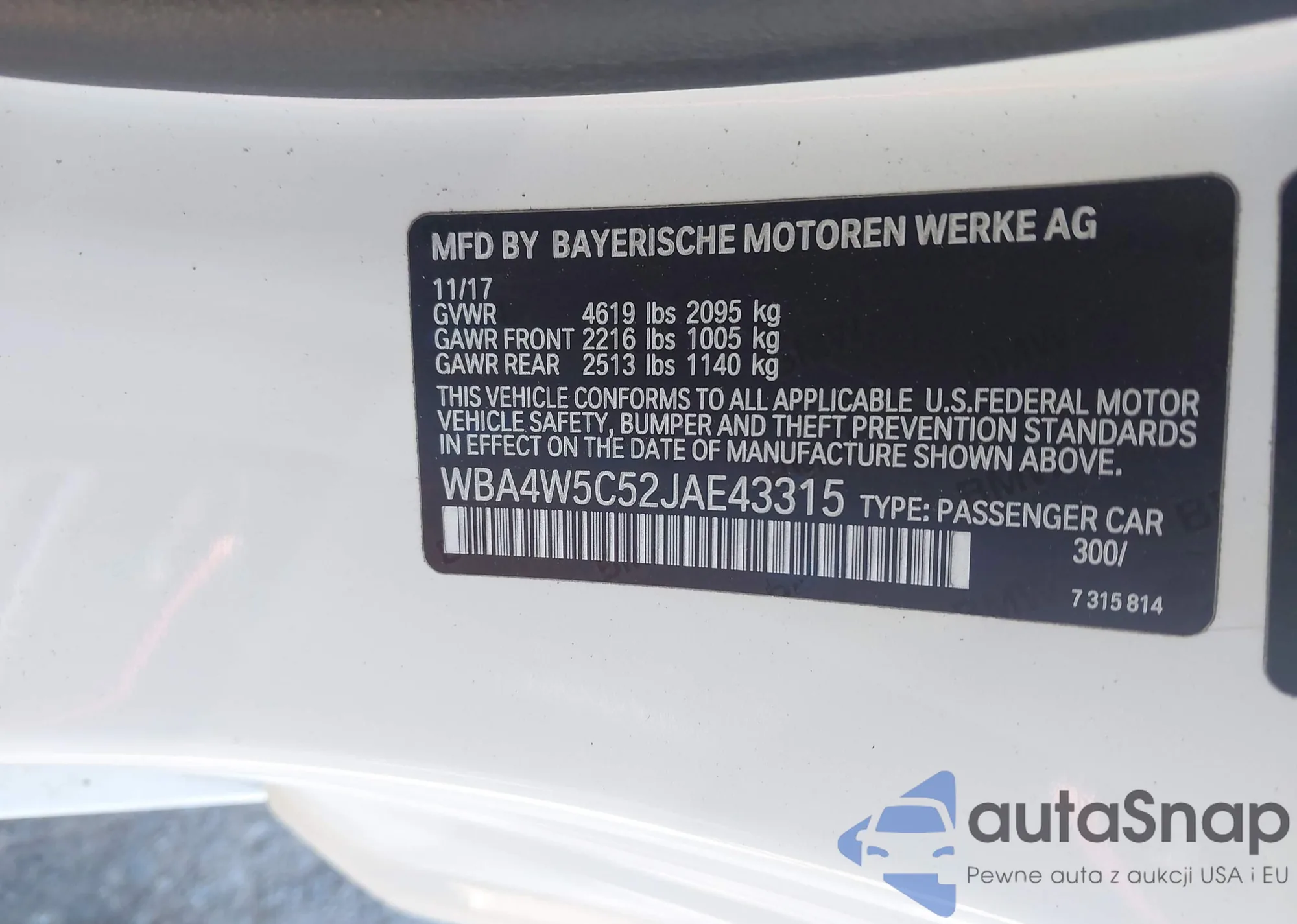 • VIN WBA4W5C52JAE43315