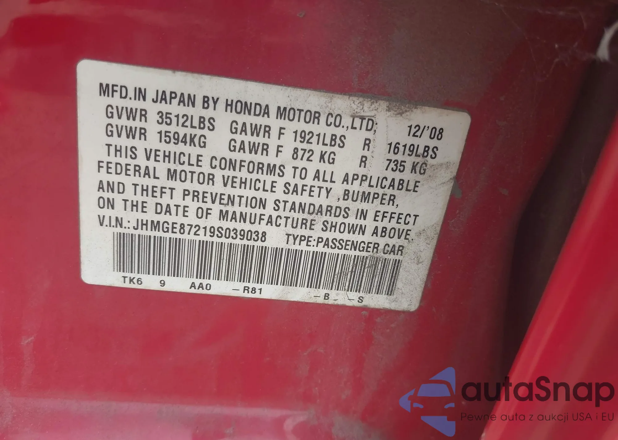 LOT: 42907386 VIN: JHMGE87219S039038