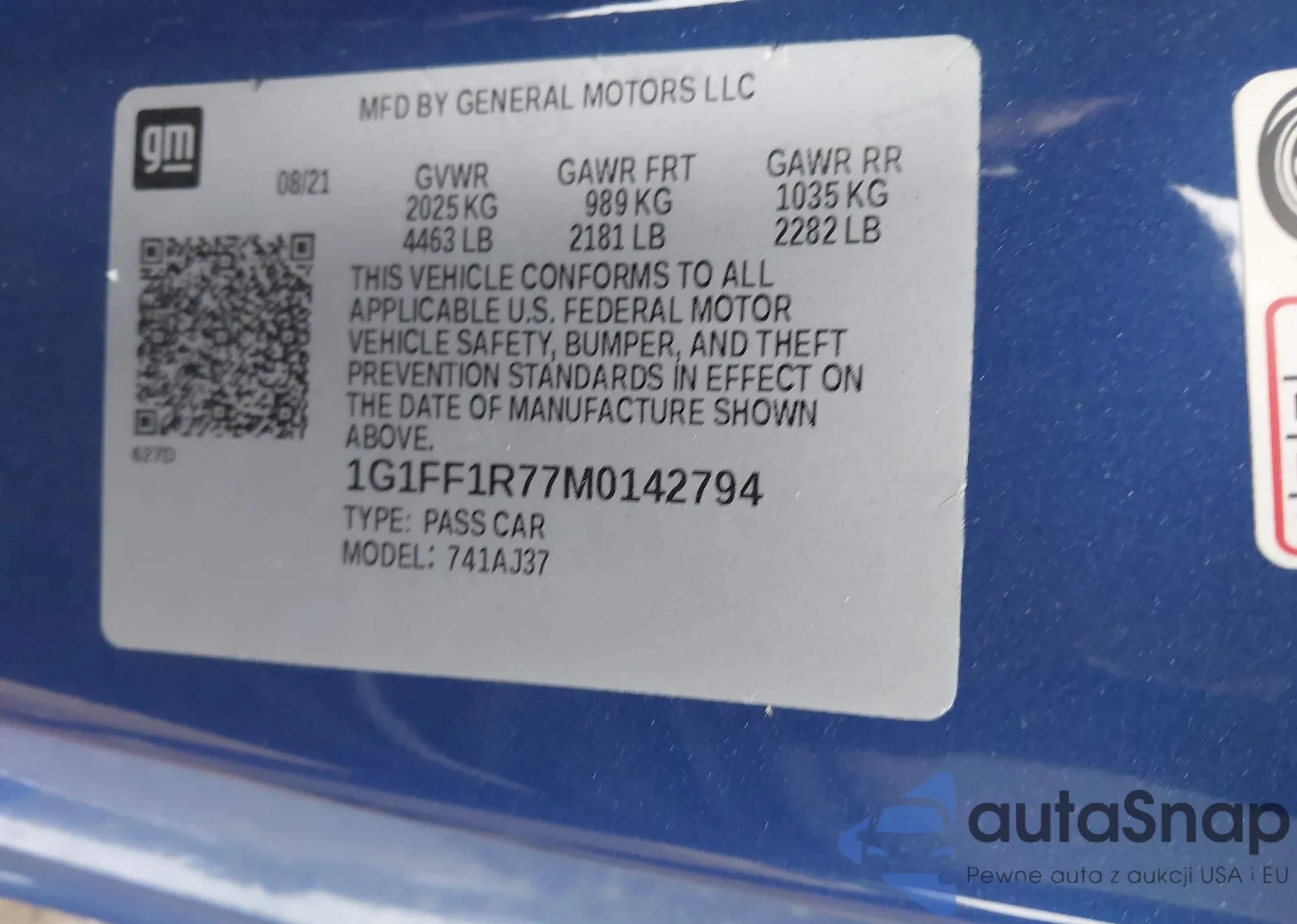 LOT: 42958761 VIN: 1G1FF1R77M0142794