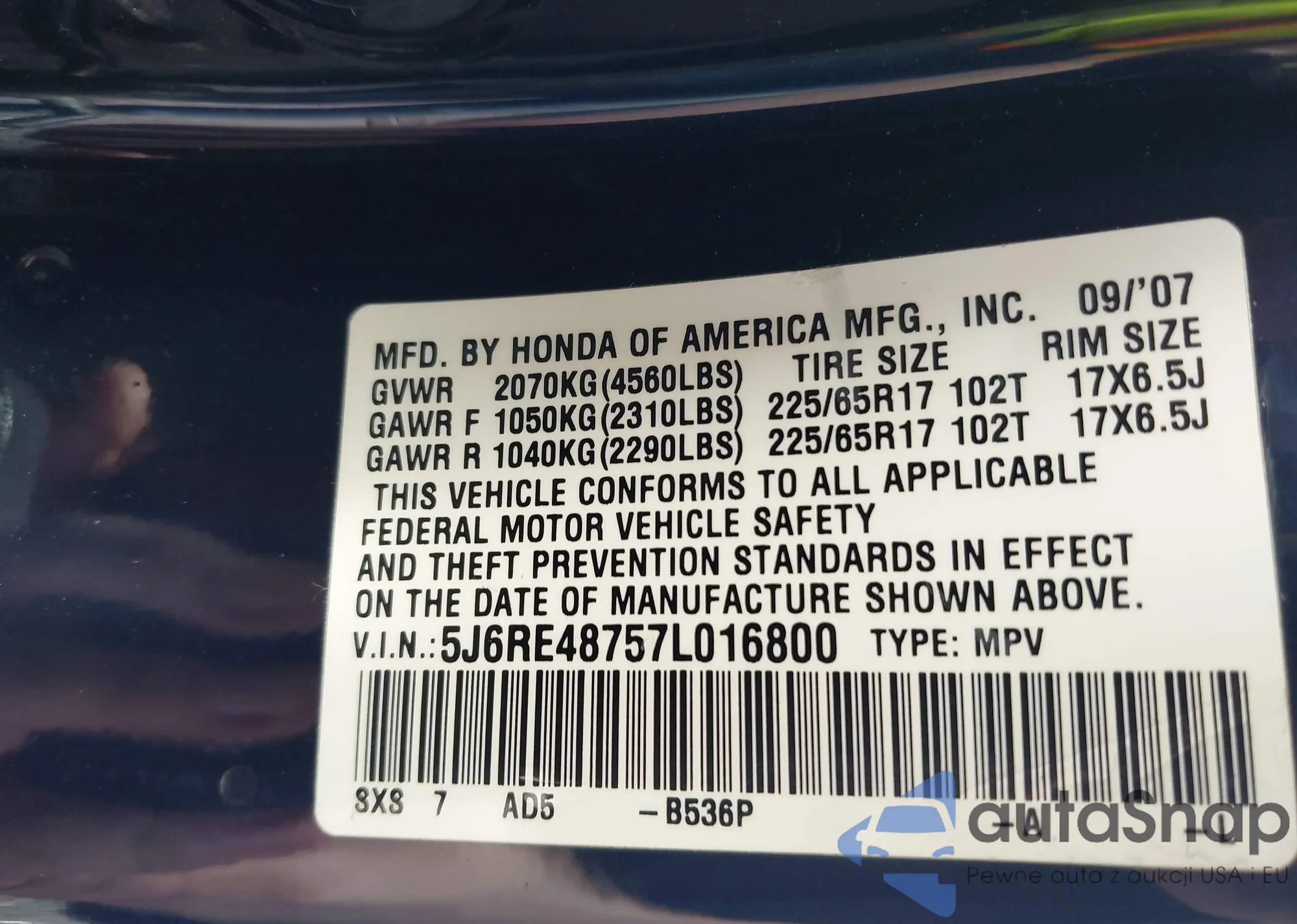 • VIN 5J6RE48757L016800