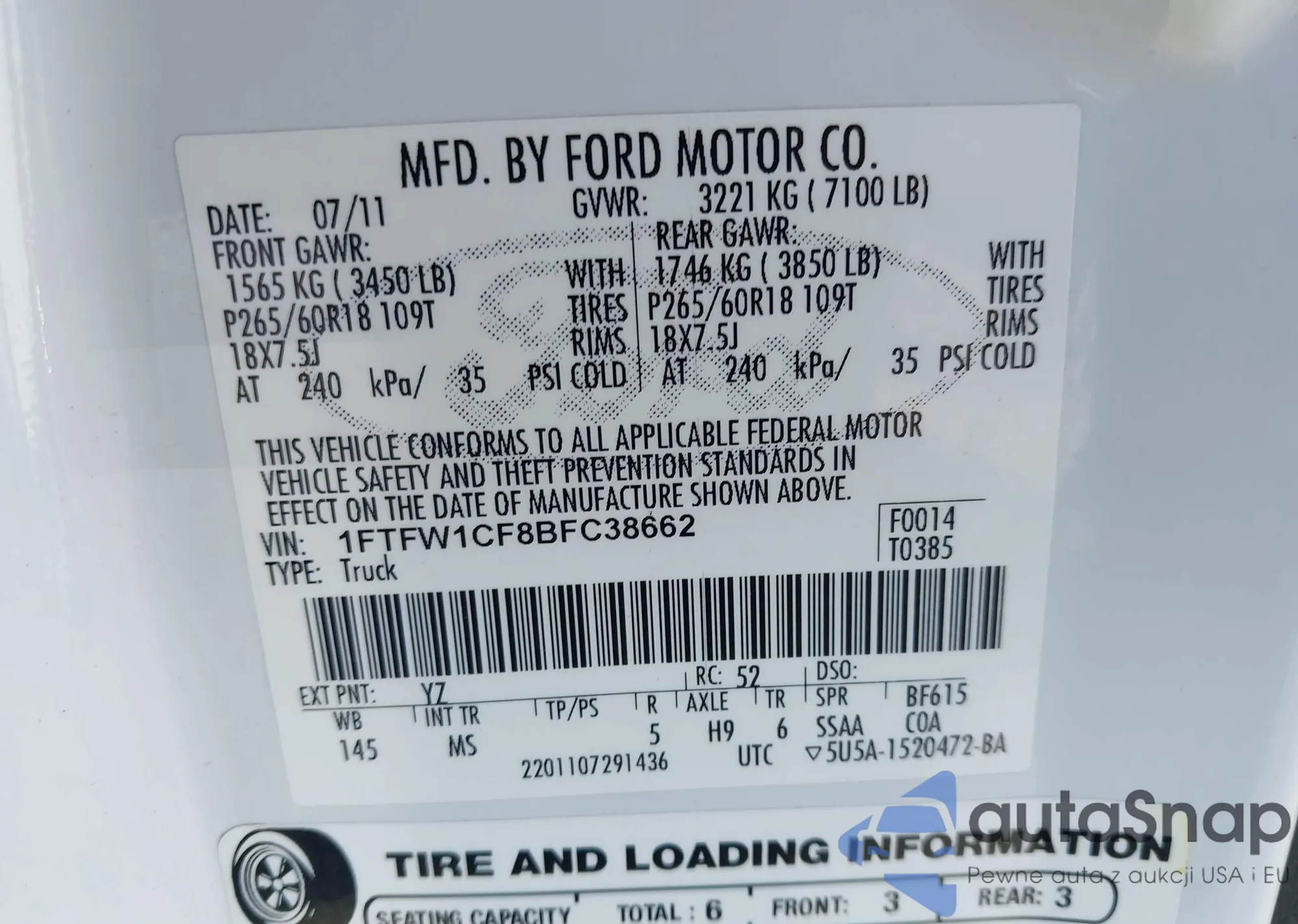 • VIN 1FTFW1CF8BFC38662