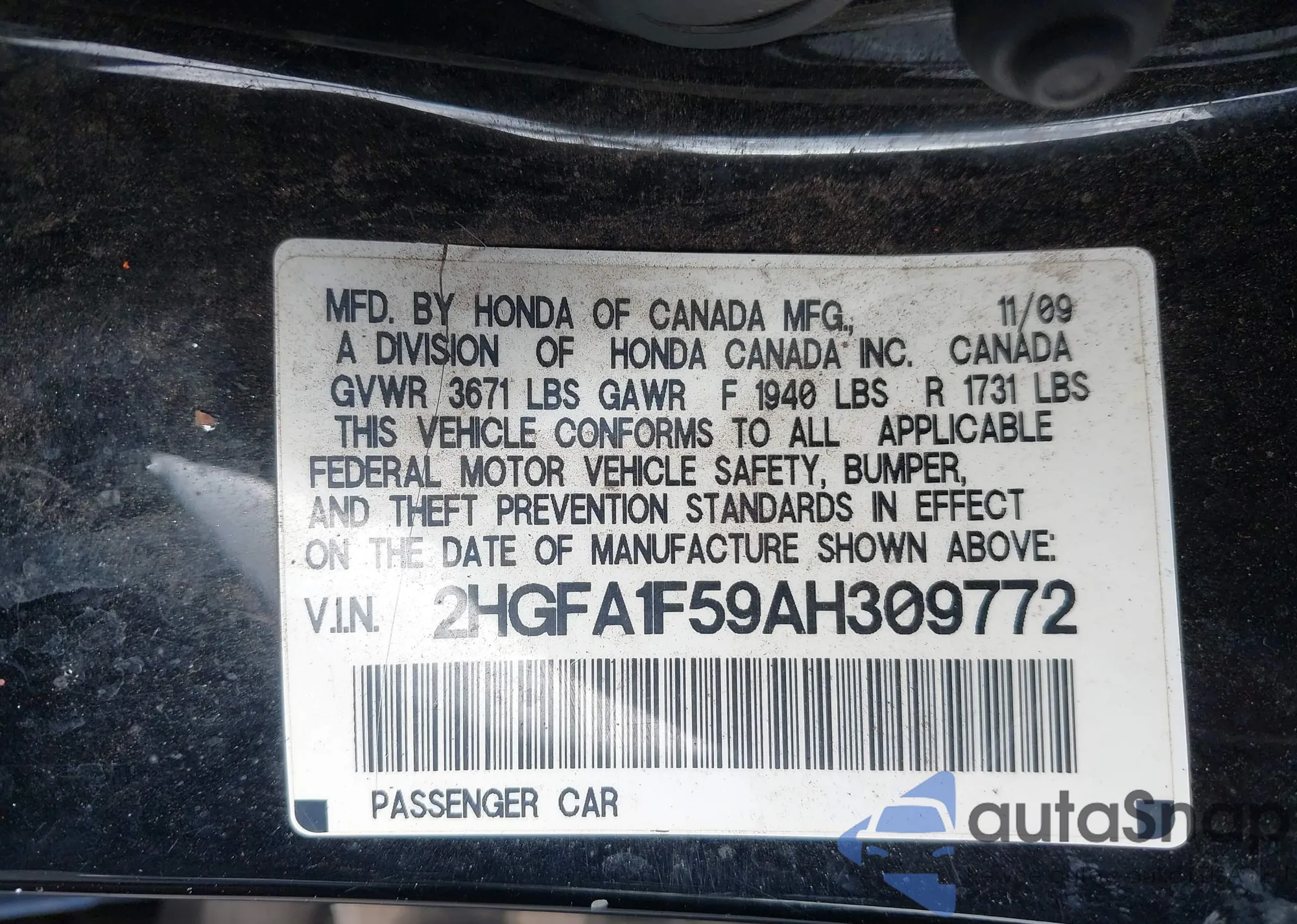 • VIN 2HGFA1F59AH309772