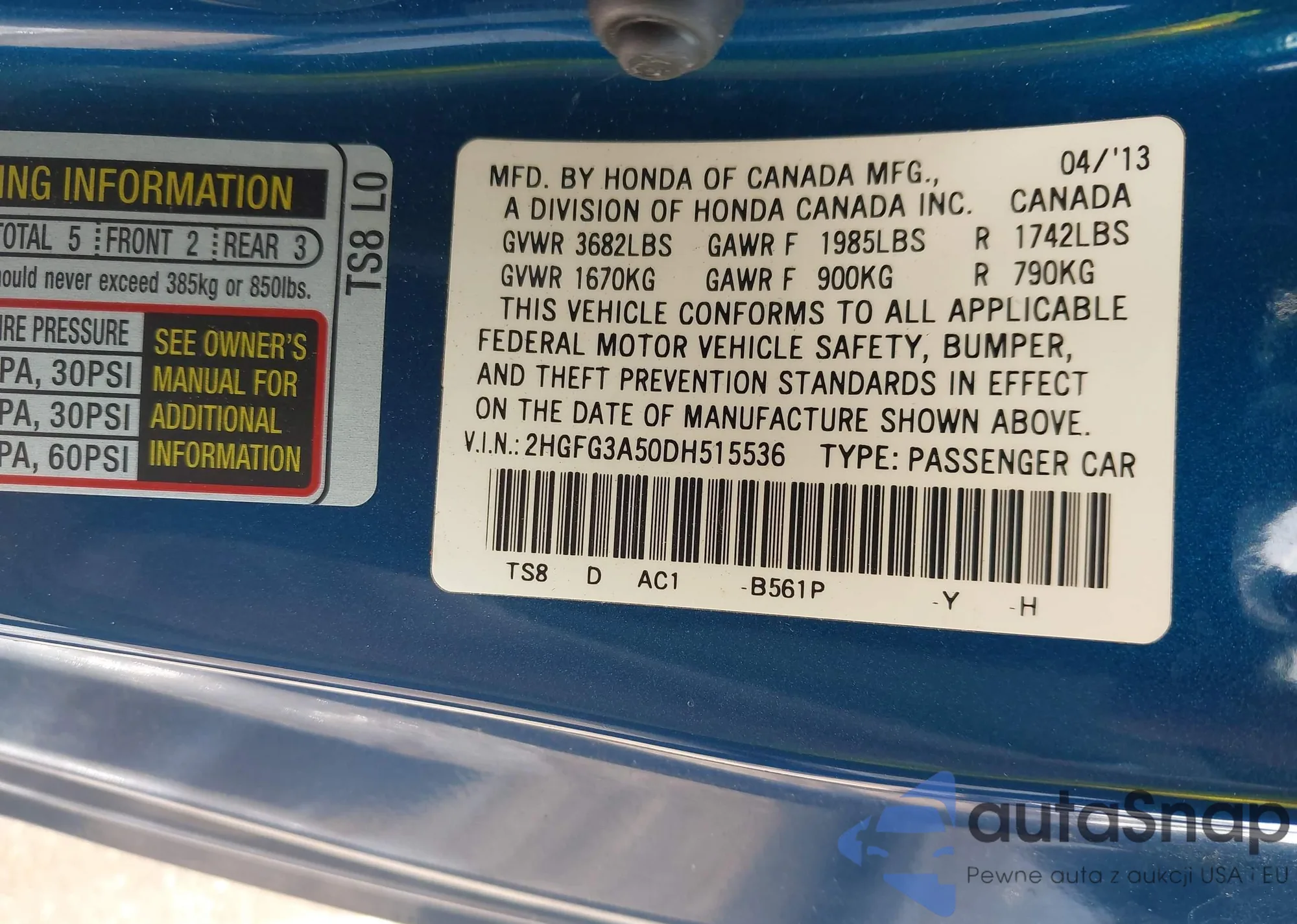 LOT: 43213306 VIN: 2HGFA166X9H541785