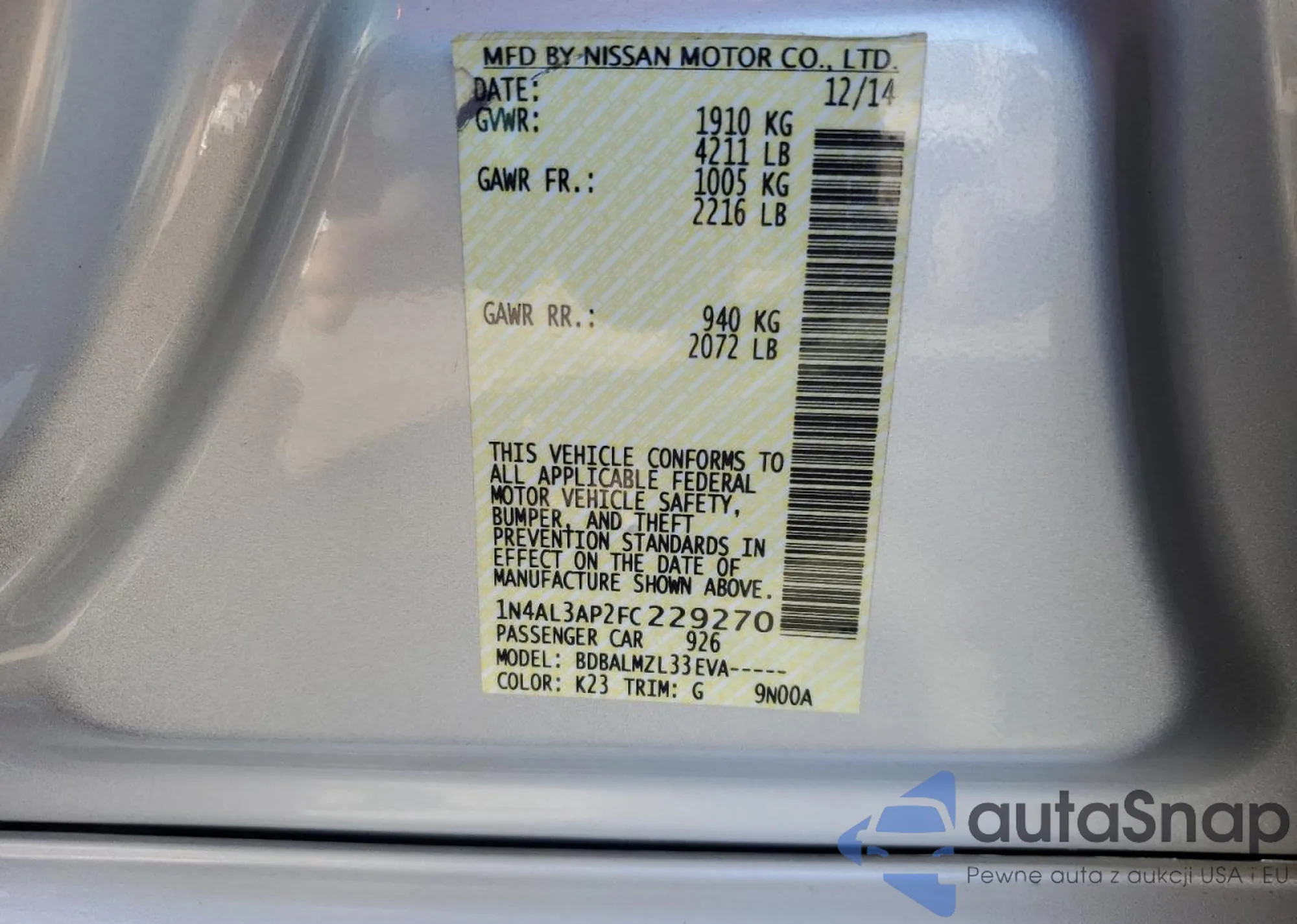 LOT: 60920495 VIN: 1N4AL3AP2FC229270